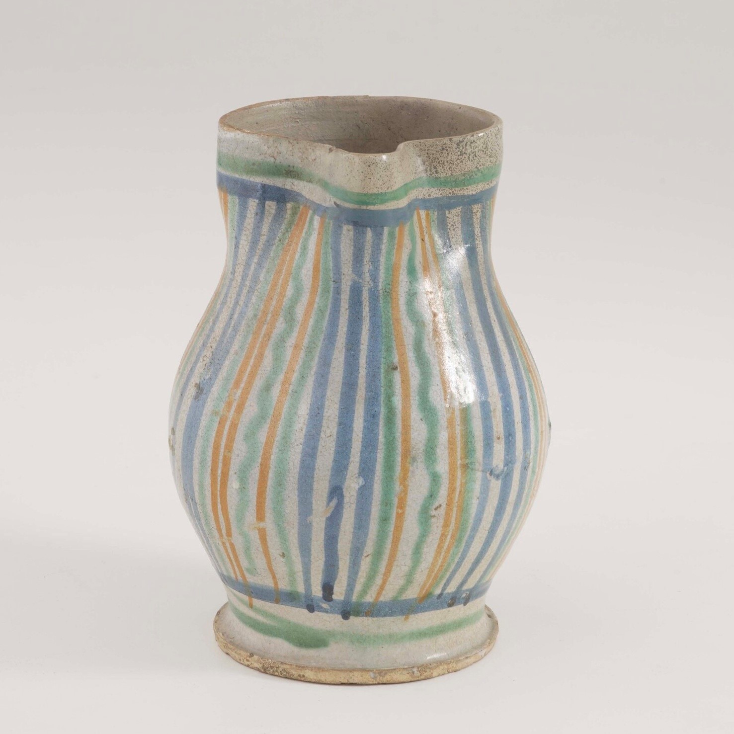 Boccale a ventre ovoidale, ampio e basso piede ad orlo arrotondato, bocca trilobata a parete verticale e manico a nastro. Su tutto il corpo, la decorazione si compone di pennellate, sia rettilinee sia ondulate, che dalla bocca si allungano verticalmente fino al piede, chiuse alle estremità da due filettature parallele. Dipinto in arancione, azzurro e verde