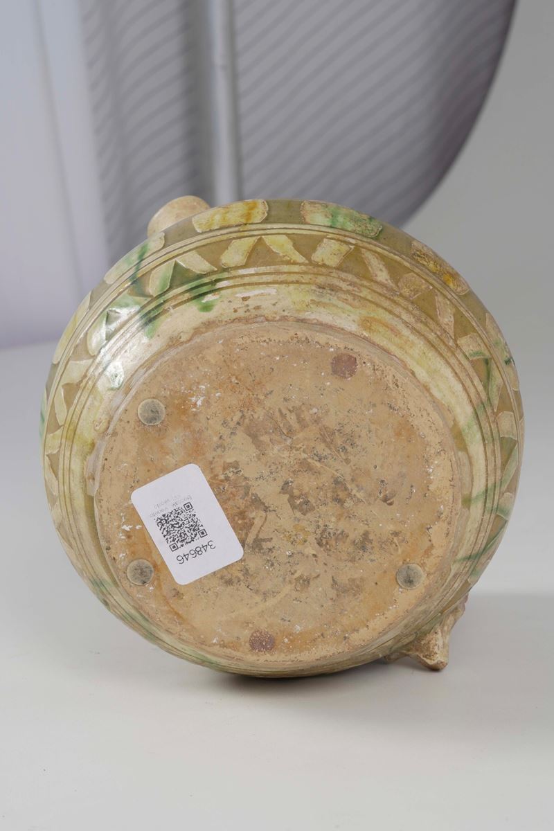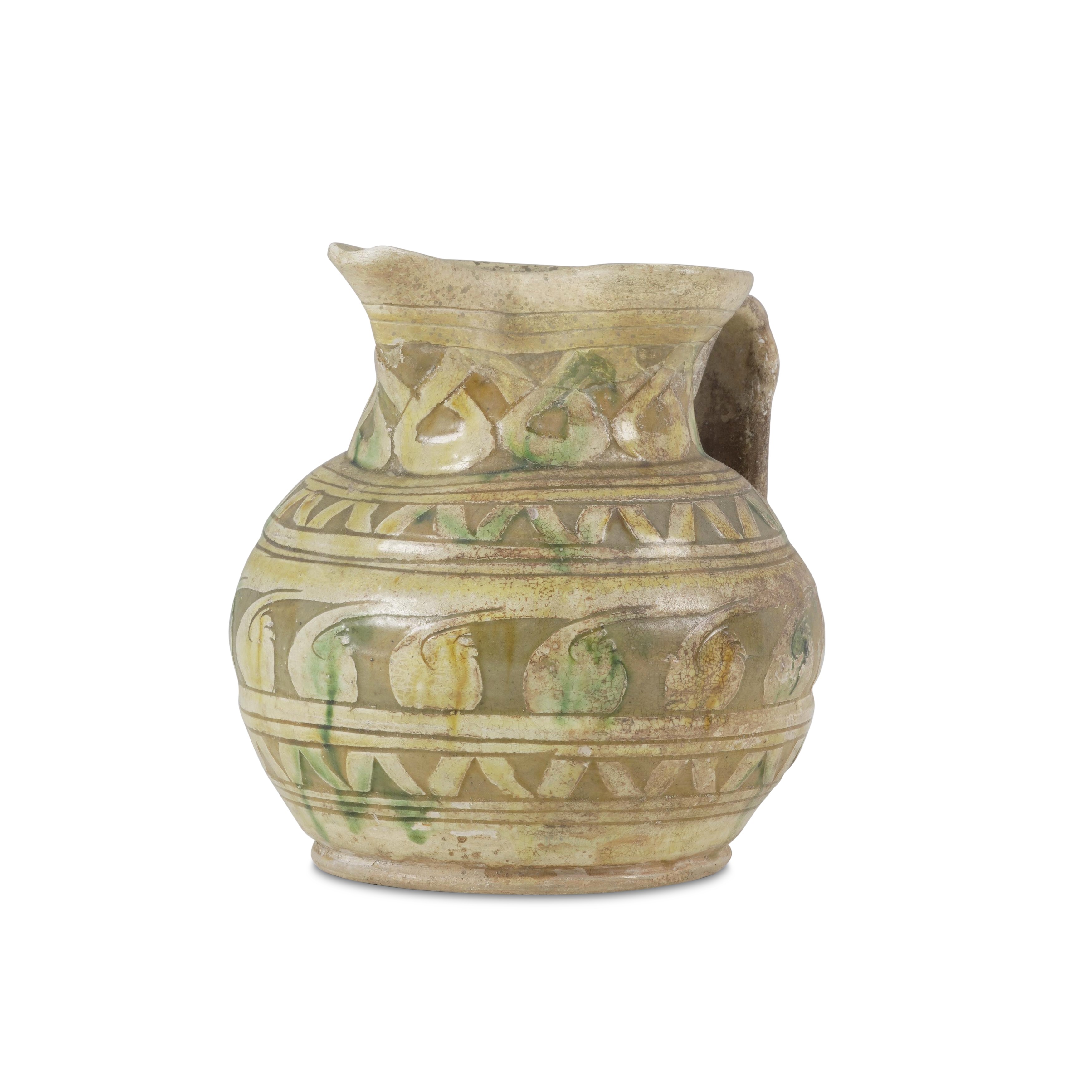 Boccale dal corpo rigonfio, in terracotta ingobbiata e graffita a punta e a stecca, con versatoio a becco trilobato. Il decoro vede un nastro ornare il collo e un motivo a girali fogliate il corpo