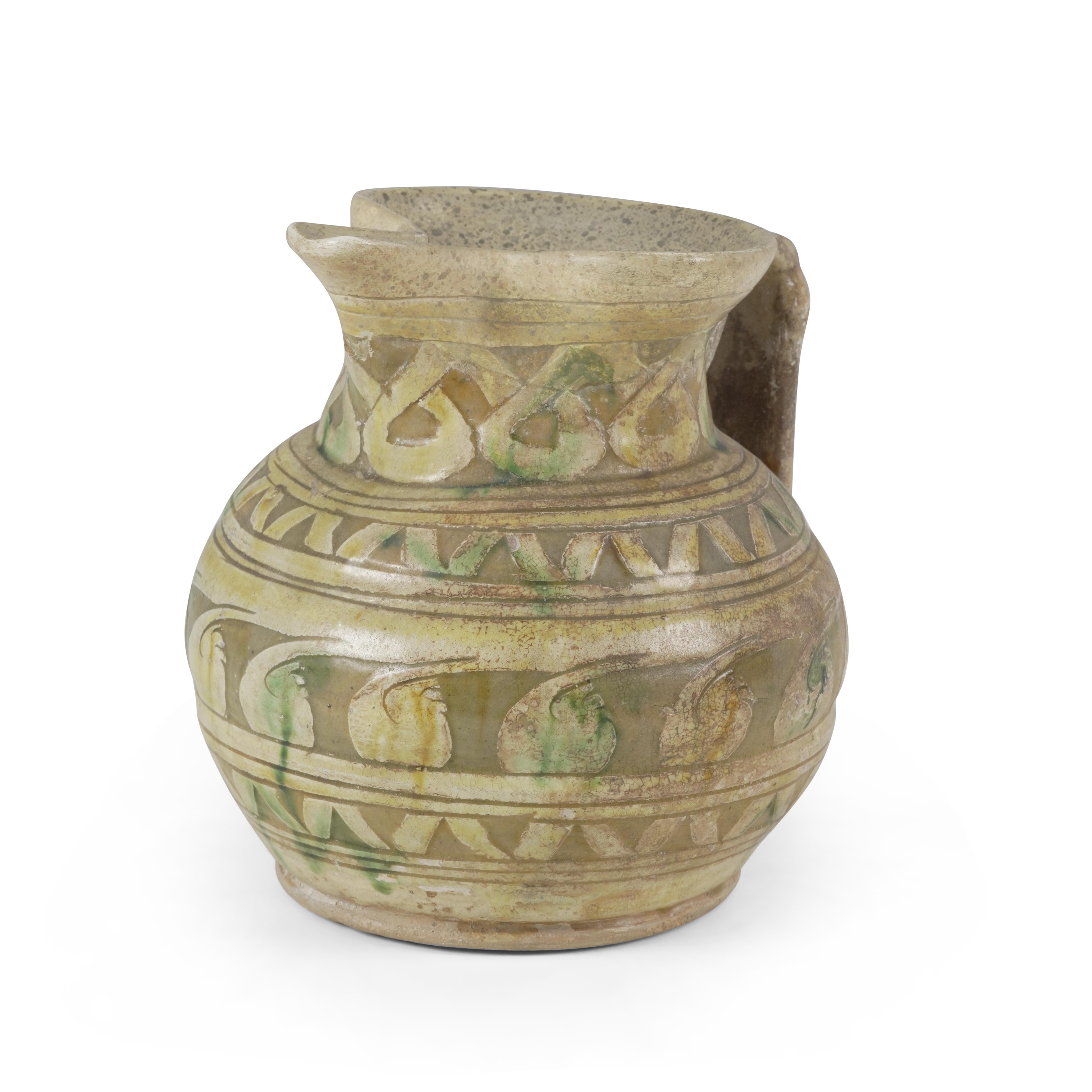 Terracotta ingobbiata e graffita. Altezza cm 18. Conservazione: integrazioni al bordo superiore, inferiore e beccuccio