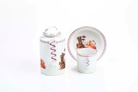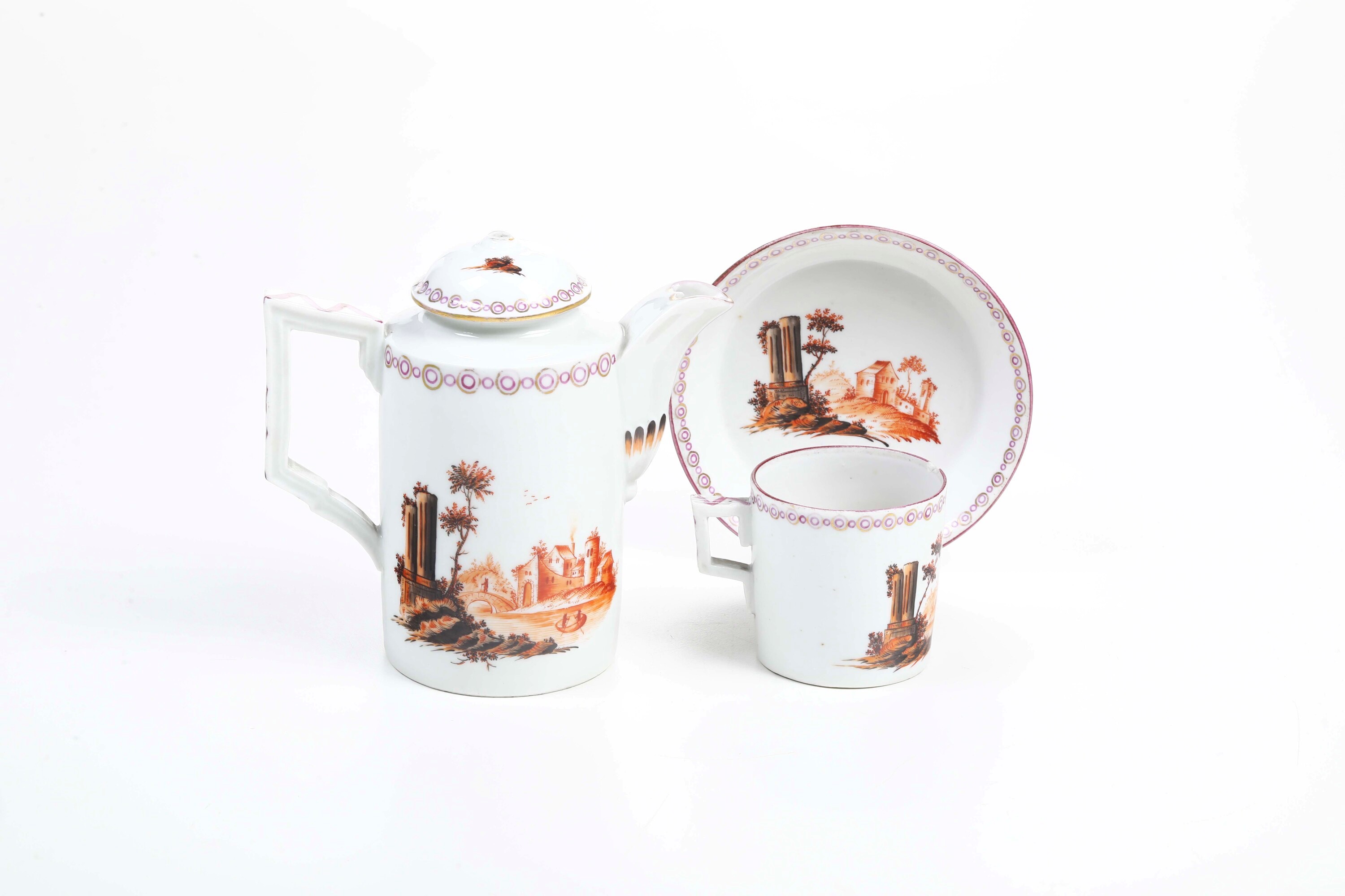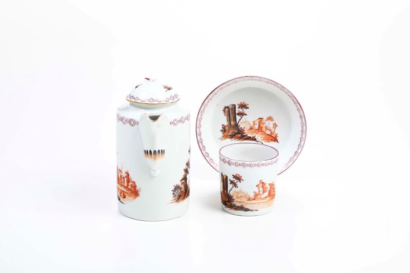 La caffettiera e la tazza presentano la tipica forma cilindrica in auge alla fine del XVIII secolo. Il beccuccio è fortemente rialzato ed il manico geometrizzato. La decorazione pittorica vede un paesaggio animato con ruderi di colonne architettoniche in primo piano, eseguita nei toni del bruno e del rosso ferro