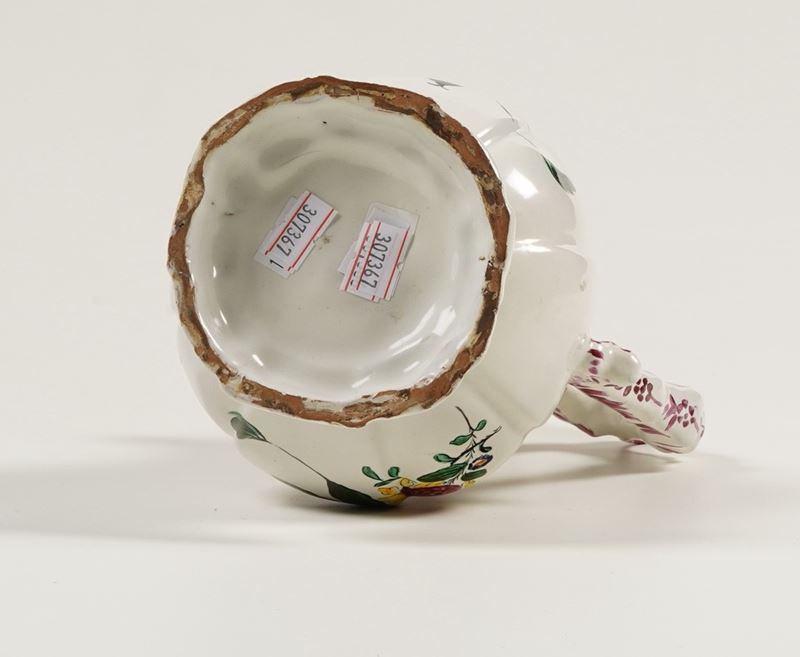 Caffettiera in maiolica fina, dal versatore a testa di gallo e ansa modellata a stampo, decorata con mazzo di fiori recisi dipinti a rapidi tocchi in tricromia a piccolo fuoco