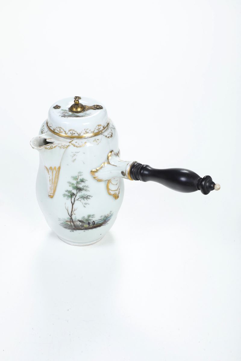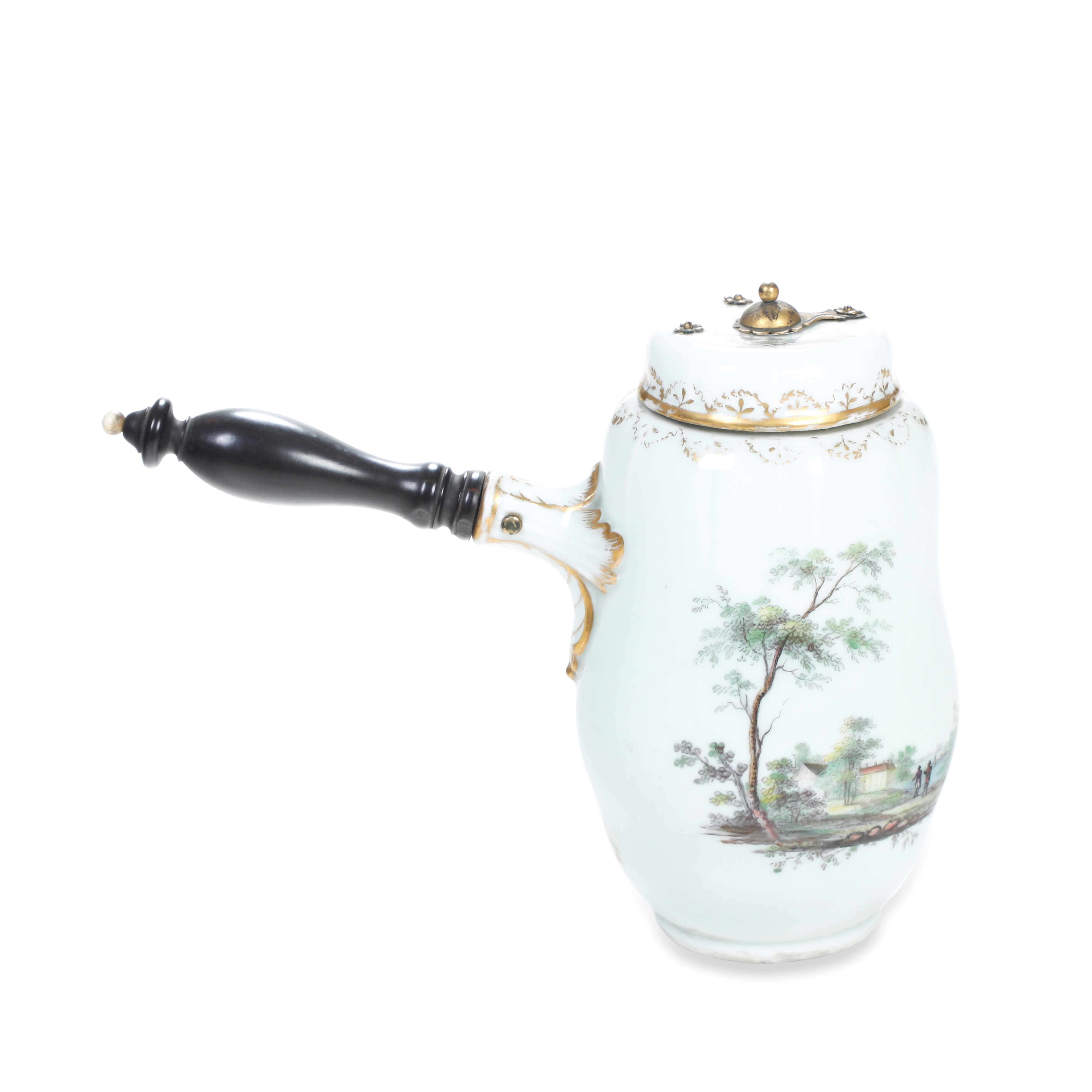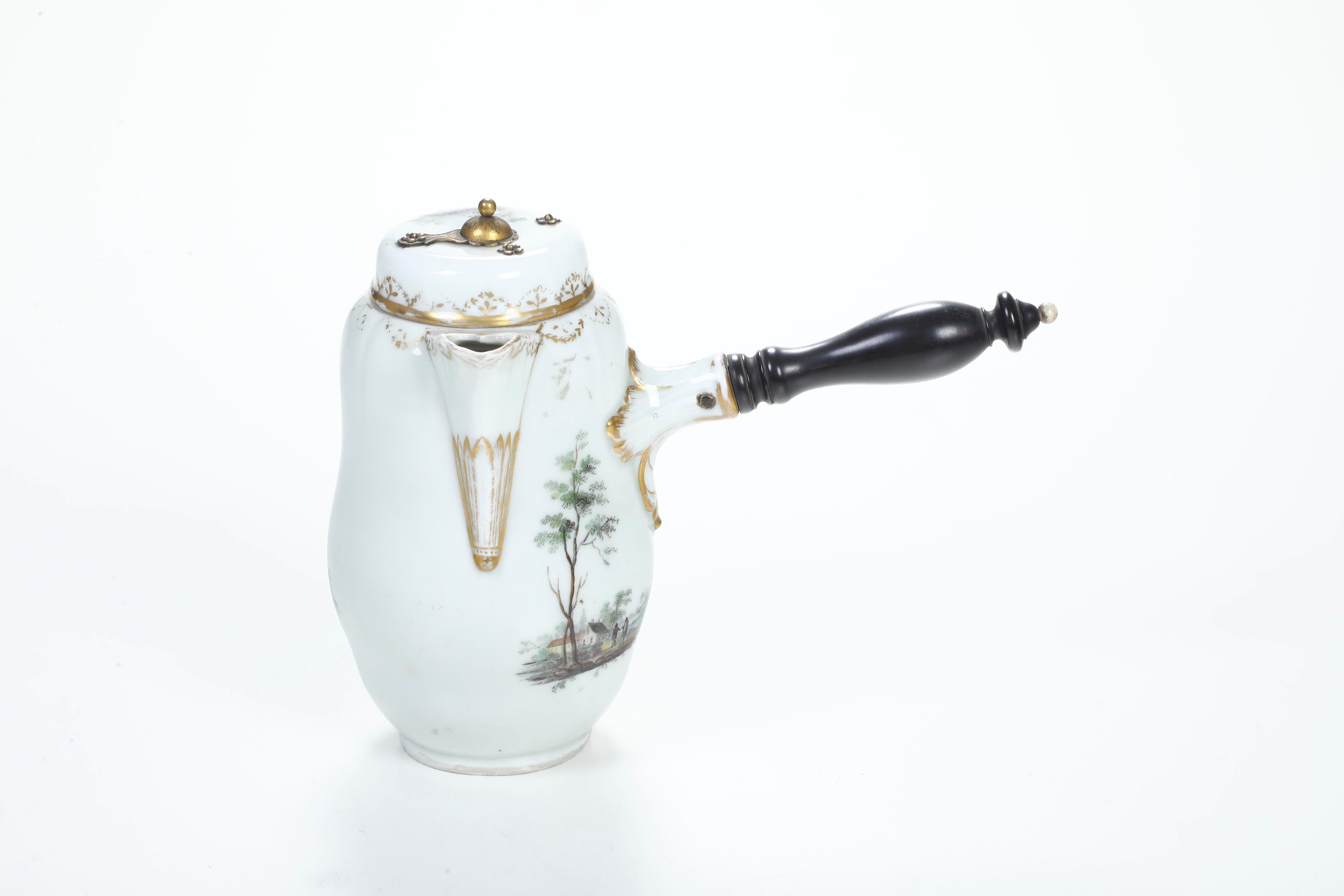 La cioccolatiera presenta un manico in legno tornito ed è decorata con ampi paesaggi animati in stile "Inselstil", ossia posati su una zolla come se fossero un'isola, con tenui colori dalla prevalenza di verde e marrone.