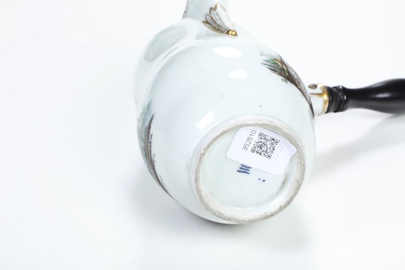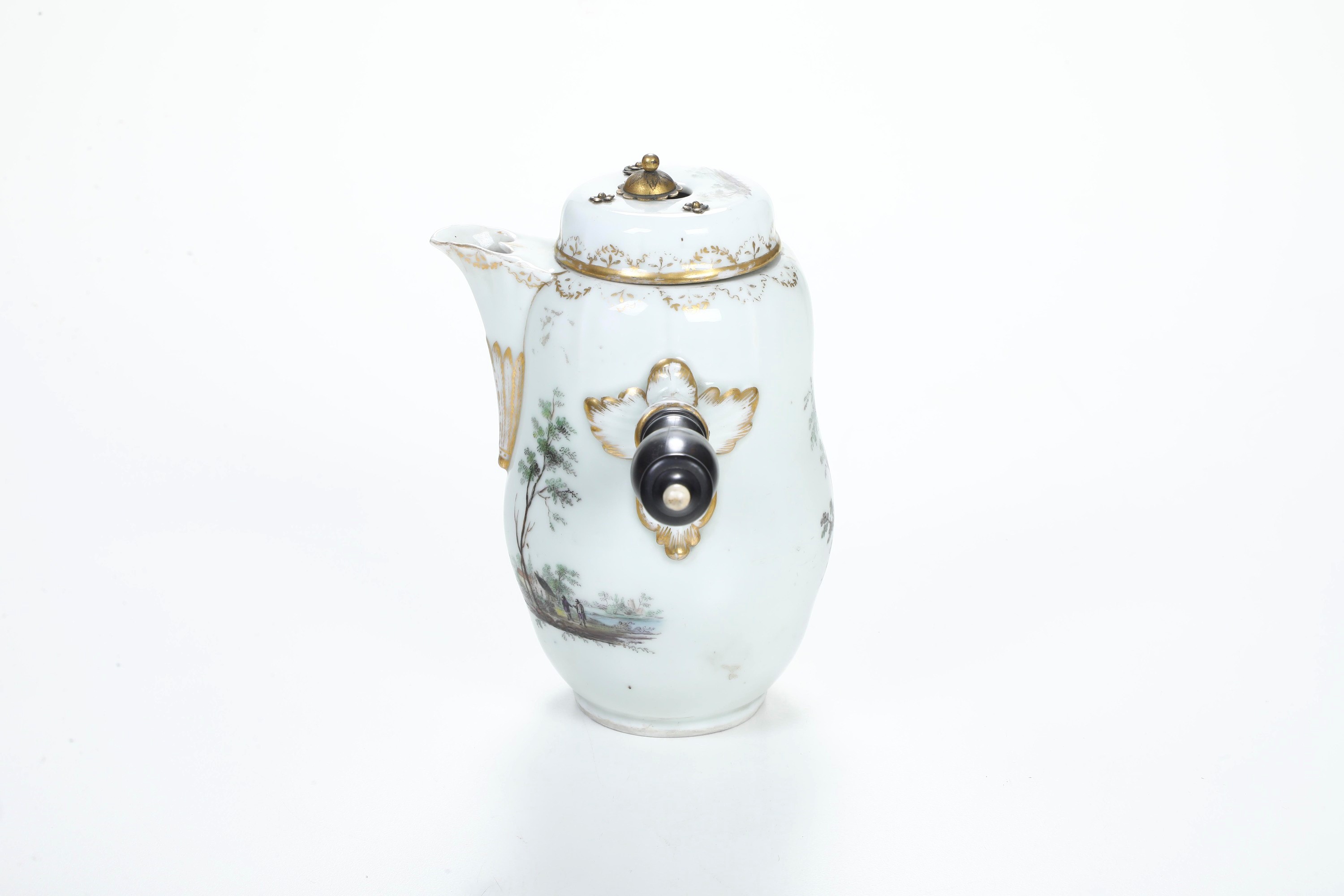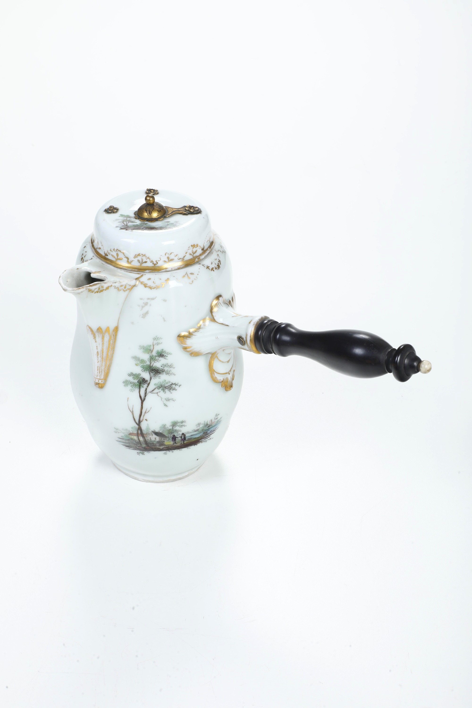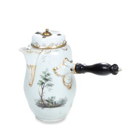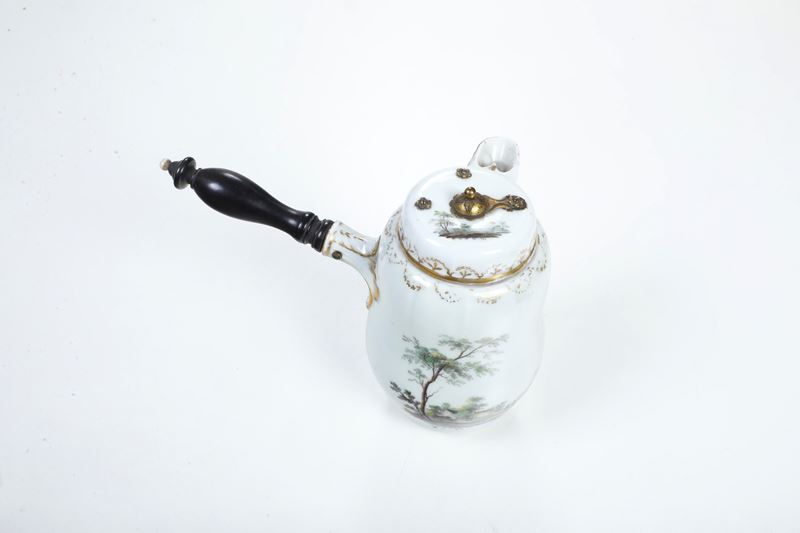 La cioccolatiera presenta un manico in legno tornito ed è decorata con ampi paesaggi animati in stile "Inselstil", ossia posati su una zolla come se fossero un'isola, con tenui colori dalla prevalenza di verde e marrone.