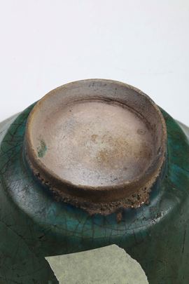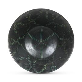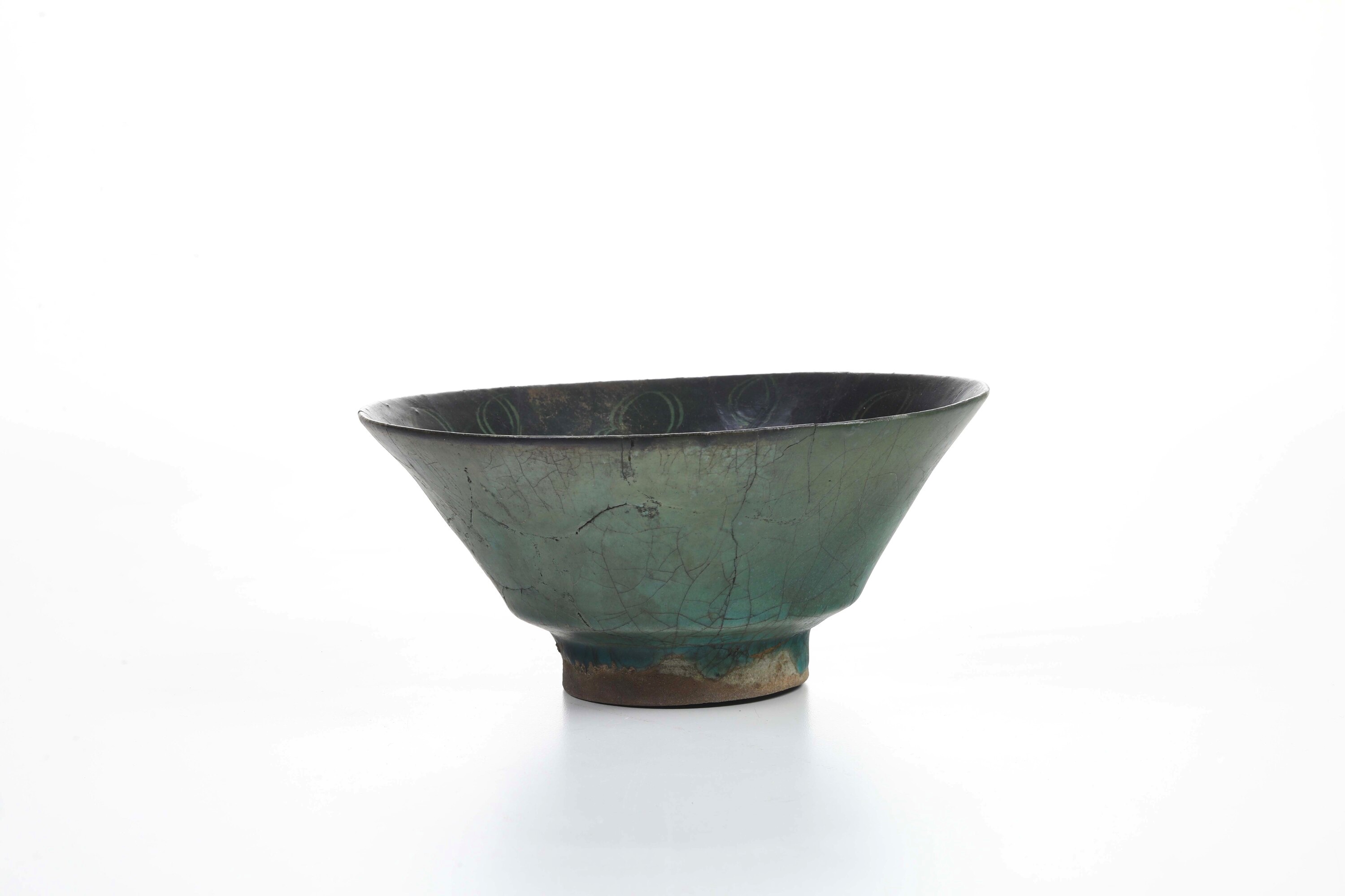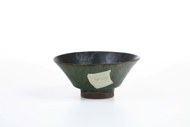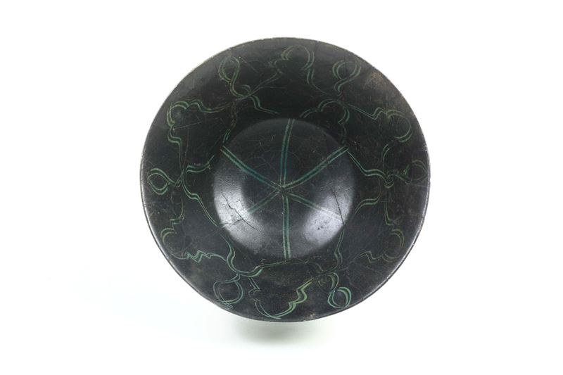 Ciotola dalla forma conica profonda, ricoperta da uno smalto nero inciso con una decorazione a silhouette su uno smalto turchese. L'esterno è liscio e ricoperto da uno smalto turchese