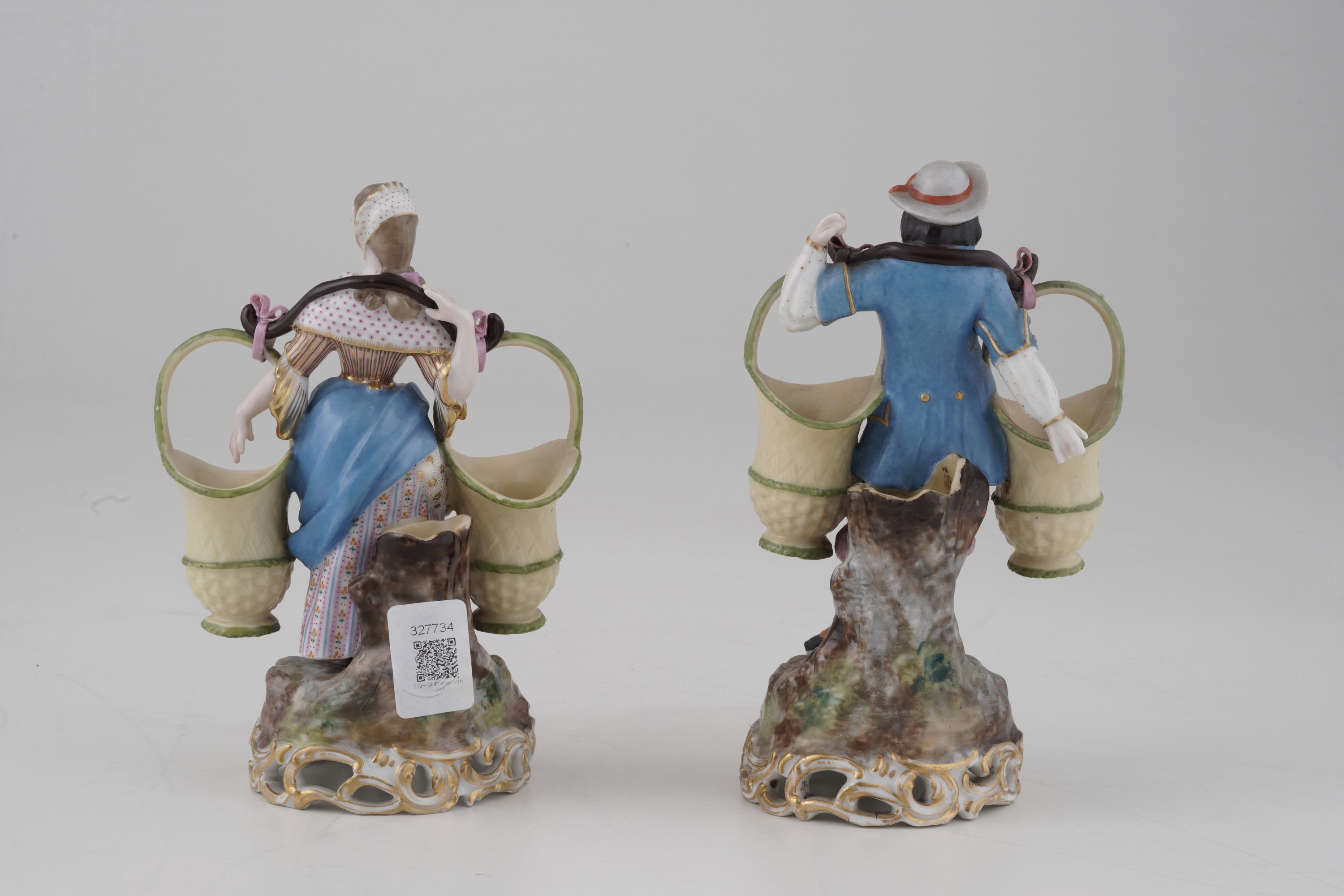 Le basi di queste figurine sono costituite da zolle erbose sostenute da rocailles, su cui poggiano rispettivamente un giovane e una giovane che portano due grandi cesti che fungono da vasetti per fiori. Anche il tronco a cui si appoggiano è cavo e funge da portafiori