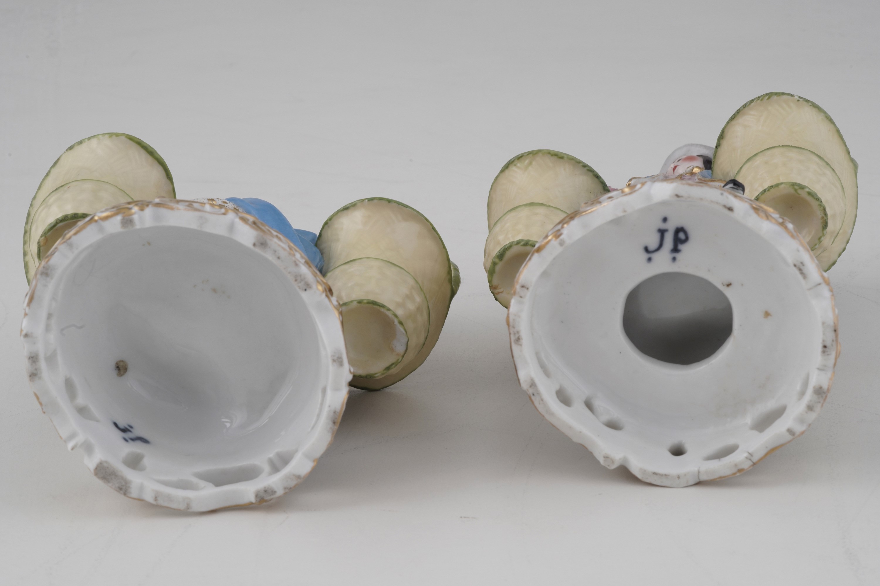 Porcellana. Marca: "JP" in blu. Altezza massima cm 20,8. Conservazione: ottima; parte anteriore del cestino di lei restaurato; mancanze minori ai nastri