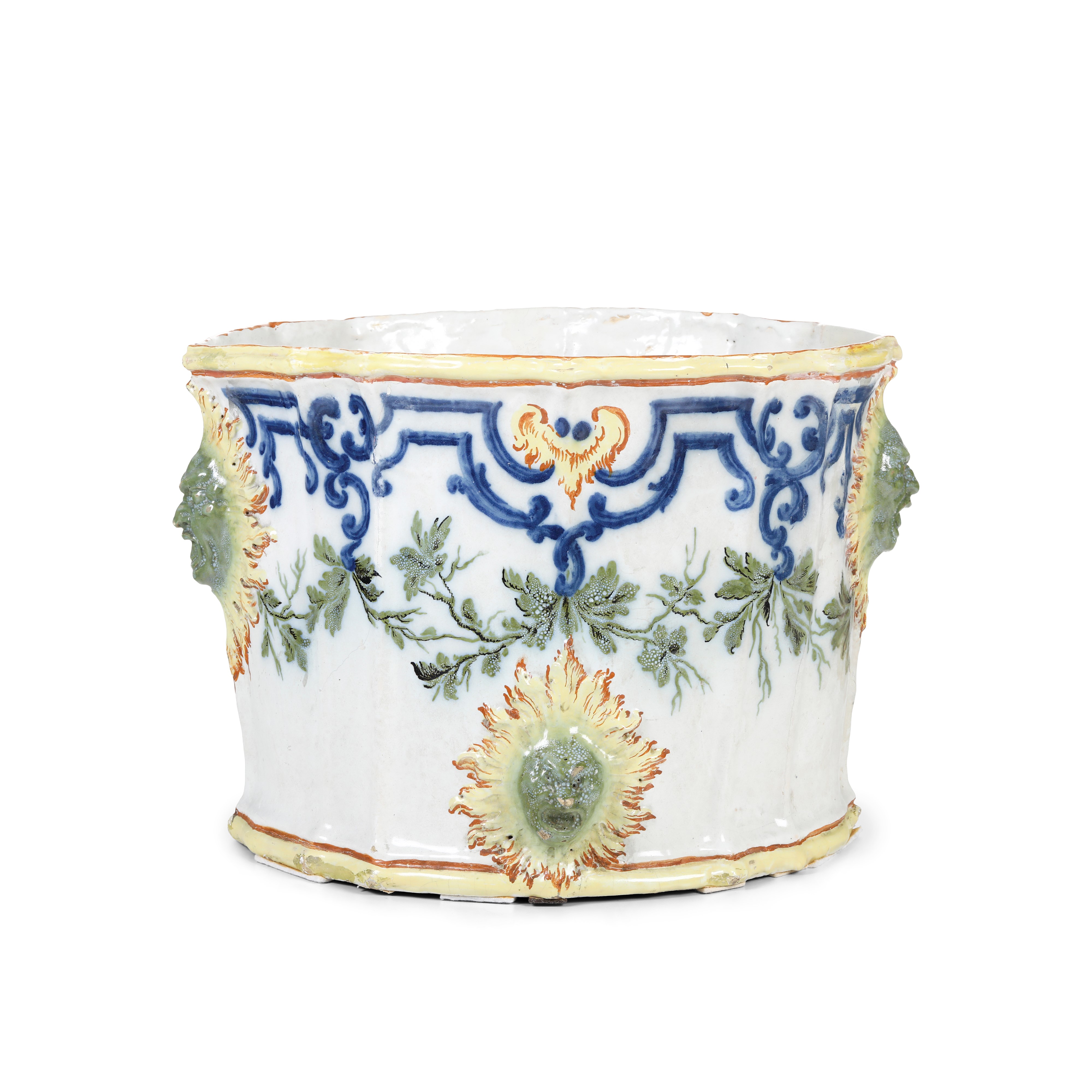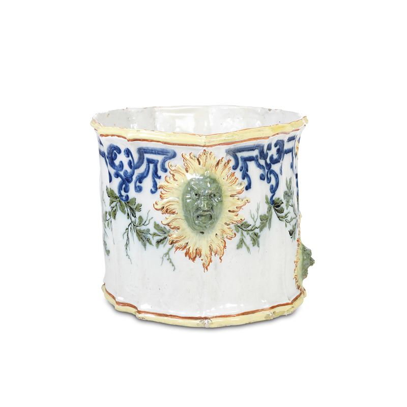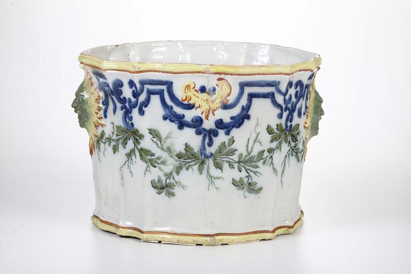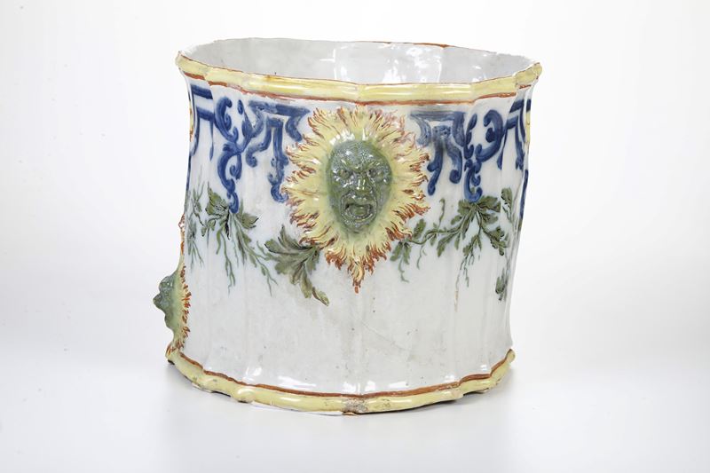 Portavaso di grandi dimensioni modellato a stampo, dalla parete costolata e bordo superiore rigonfio. Il gioco plastico è arricchito da tre grandi mascheroni virili fortemente espressivi. La decorazione pittorica vede nella fascia superiore un motivo blu, ispirato a griglie grafiche francesi, da cui pendono festoni di sottili rametti fogliati in monocromia verde. I mascheroni urlanti, colorati in verde, sono potenziati dai forti raggi solari che li circondano. All’interno, sul fondo, vi è la marca a lanterna, dal tratto sottile in bruno, provandone l’origine savonese, e lo stile potente espressivo porta ad assegnare quest’opera alla produzione storicista di fine Ottocento o primo Novecento