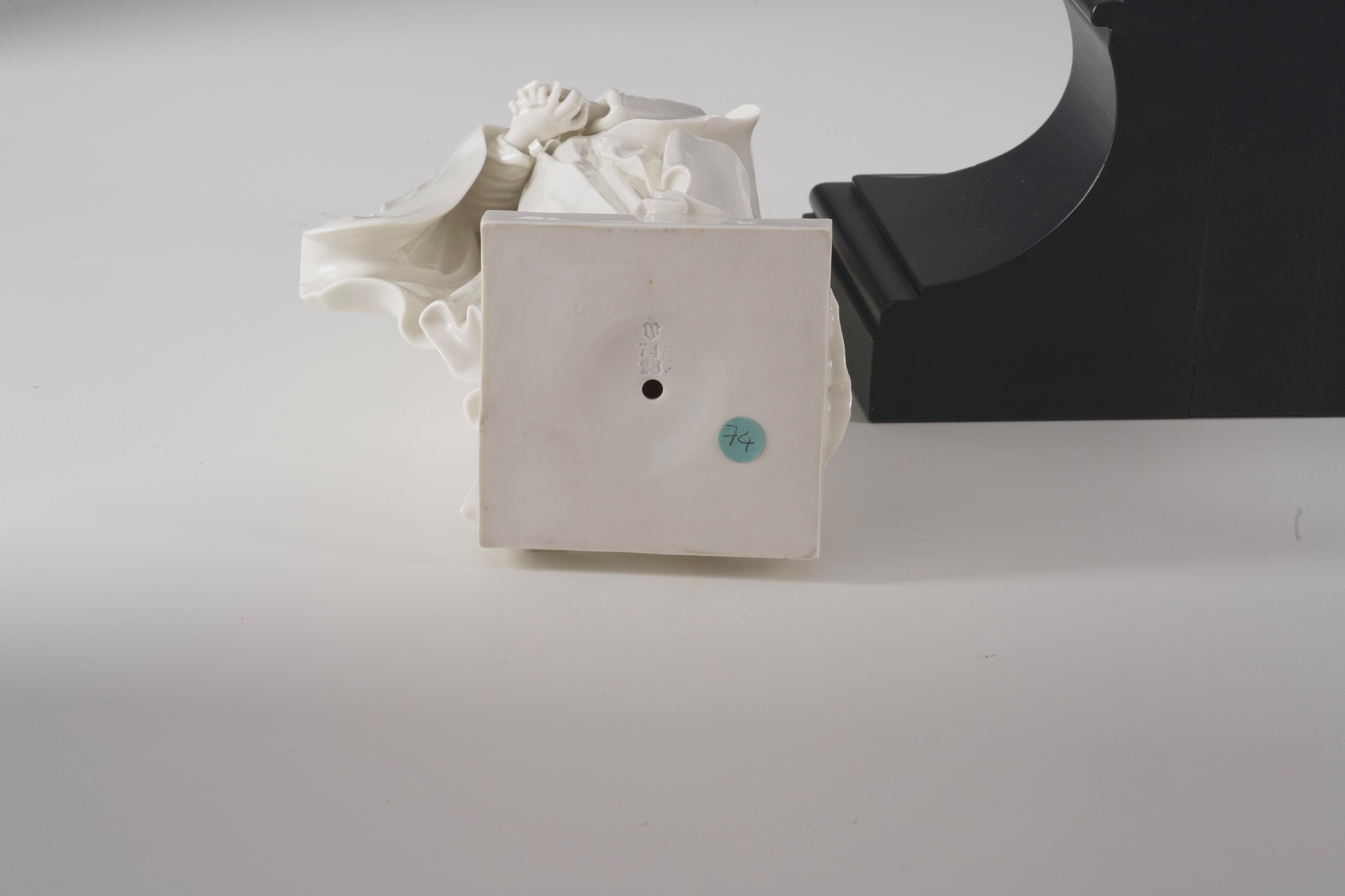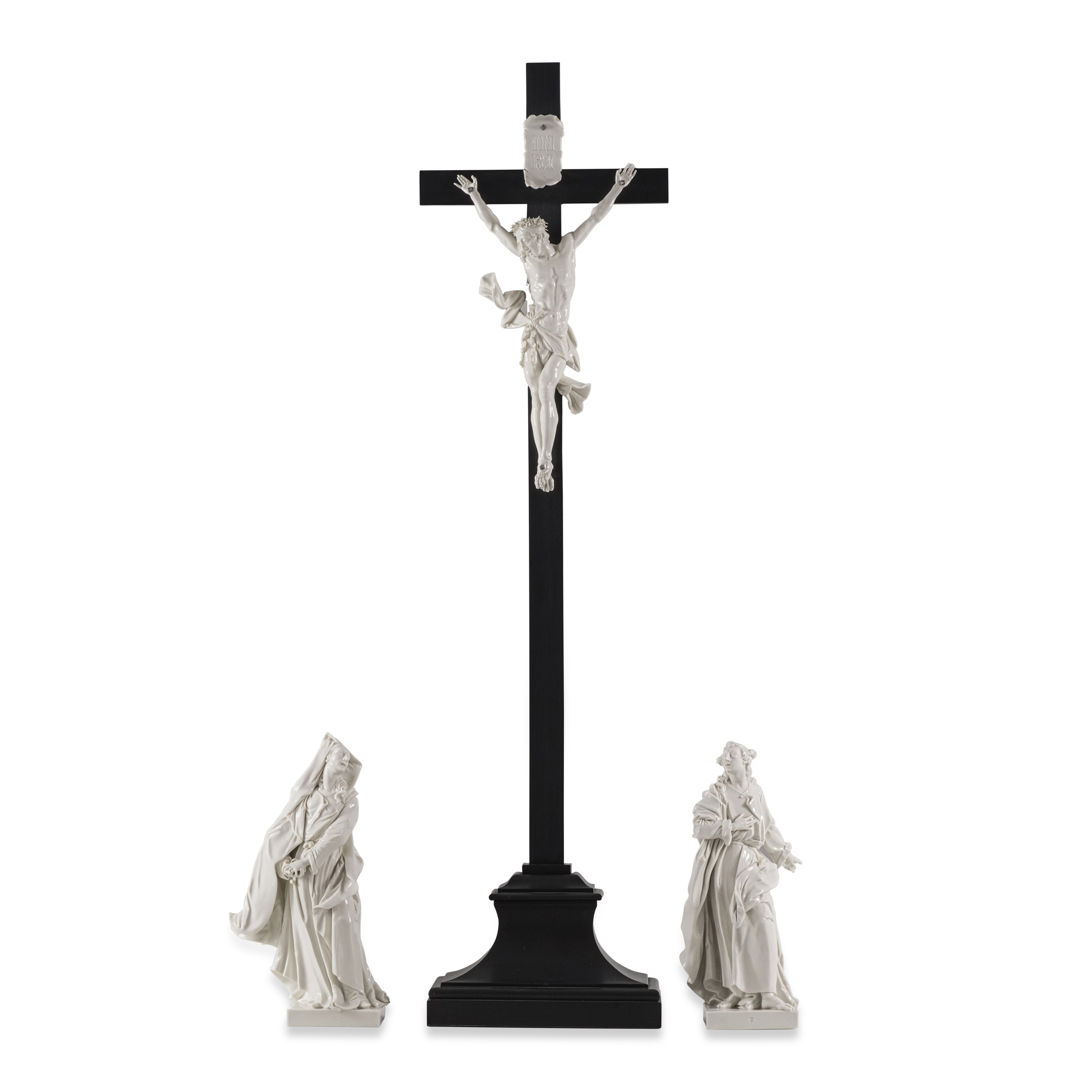 Porcellana. Marca: scudo bavarese impresso. Dimensioni: altezza croce in legno cm 101; altezza Gesù cm 38; Maria cm 29,5; San Giovanni cm 31. Conservazione: ottima; un’insignificante sbeccatura al velo di Maria