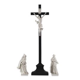Gesù ha il corpo piegato a S, porta la corona di spine sulla testa e ha gli occhi e la bocca aperti. Sulla croce si trova la placchetta con la scritta "INRI". I santi poggiano su una base quadrata: Maria ha la testa rivolta verso Cristo e tiene le mani sopra il fianco destro, dolorosamente intrecciate. Giovanni indossa una lunga tunica e un mantello che gli scende sulla gamba sinistra; la testa è rivolta verso Cristo, la bocca è aperta e la mano destra è portata al petto