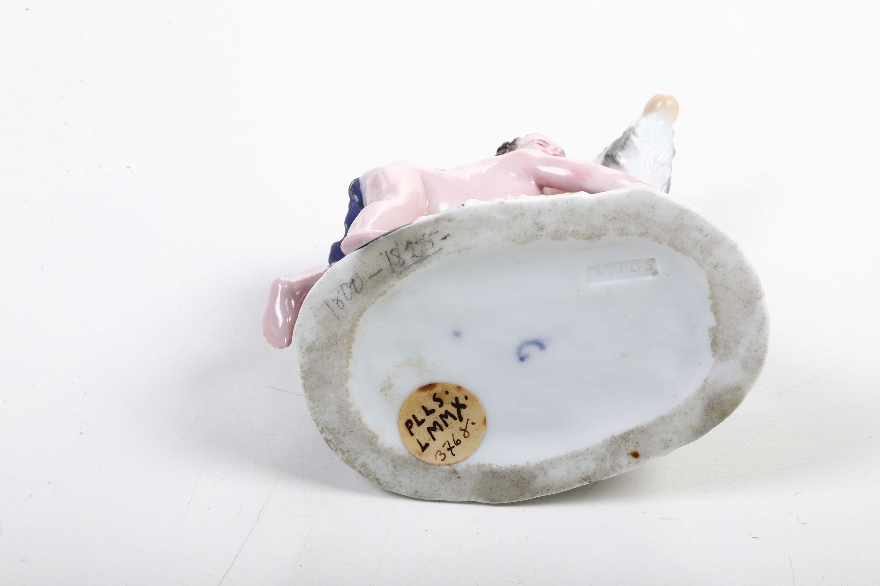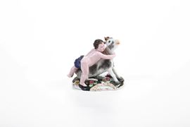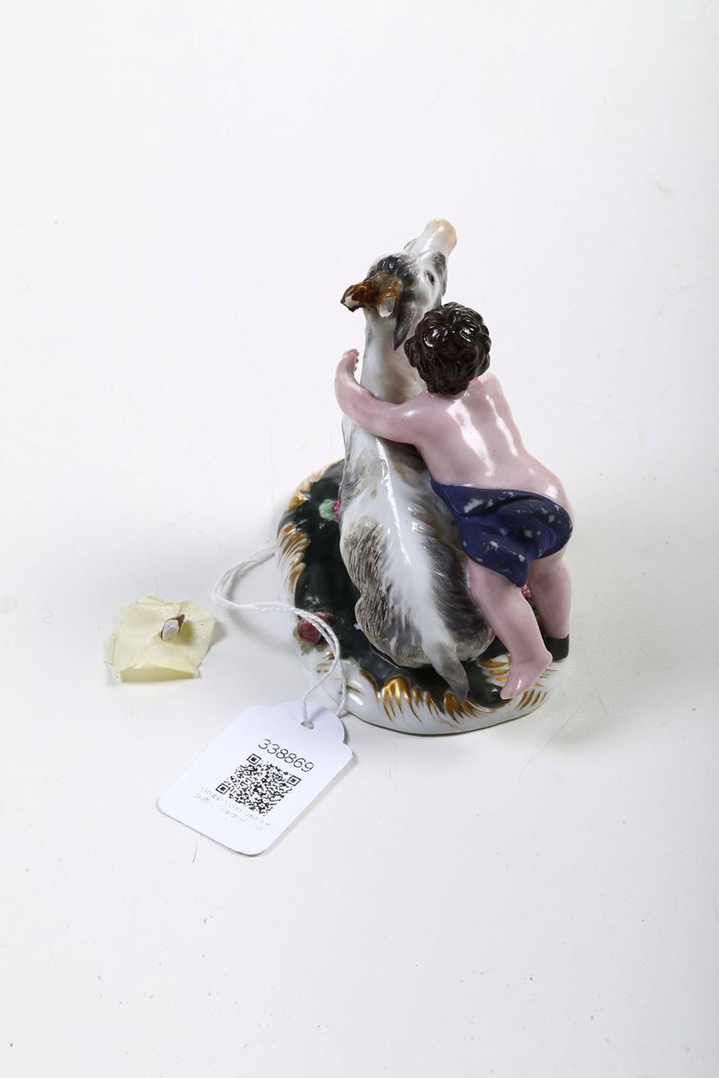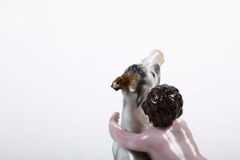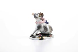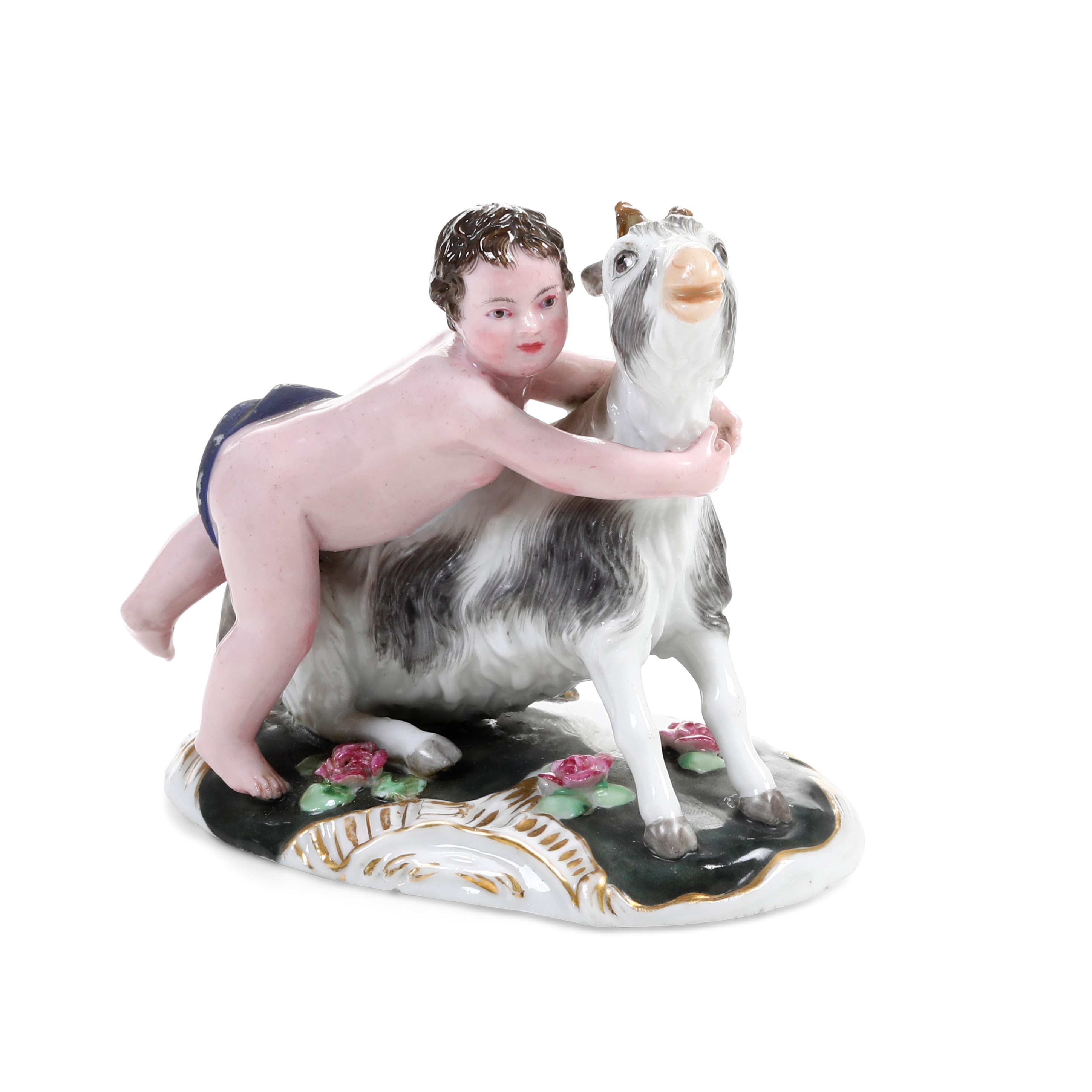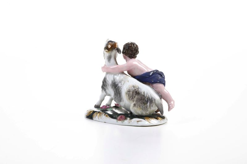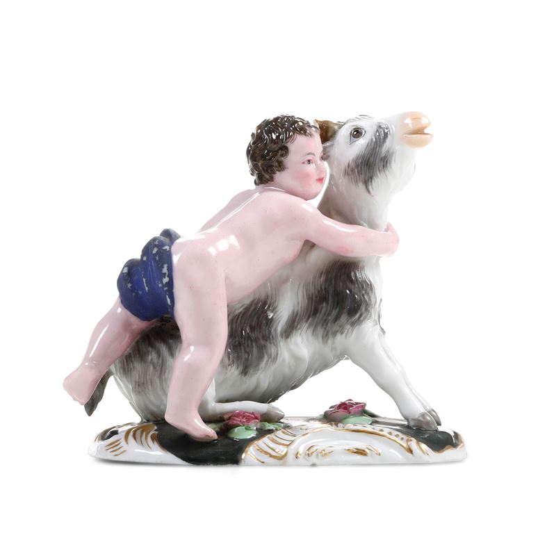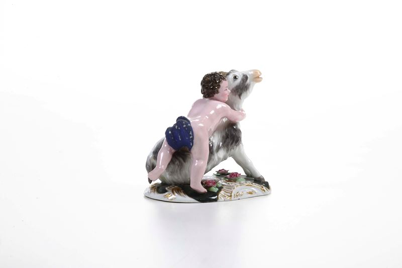 Porcellana. Marca: “G” in blu e marca in cirillico impressa. Altezza: cm 8,4. Conservazione: corna e un orecchio del caprone in parte mancanti o restaurate