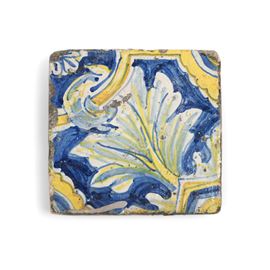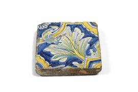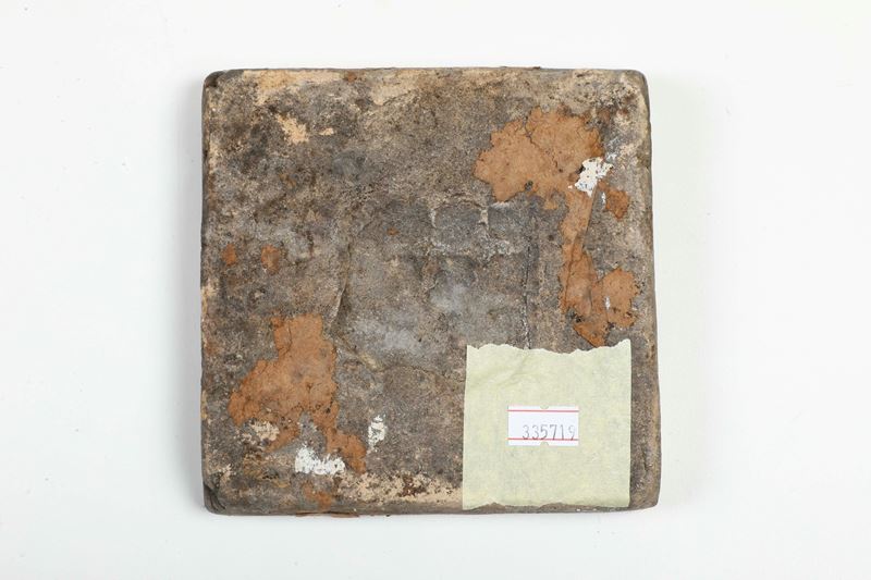 Terracotta smaltata. Dimensioni: spessore cm 2,8 circa; cm 14x14. Conservazione: buona; piccole sbeccature e cadute di smalto