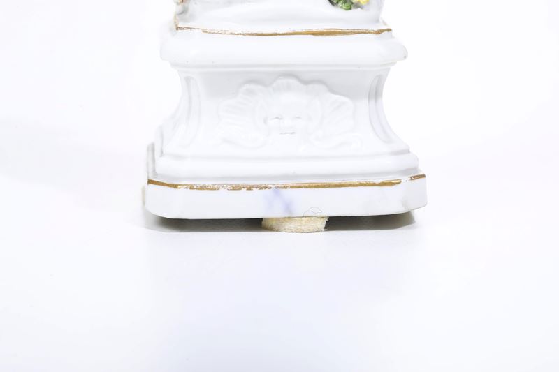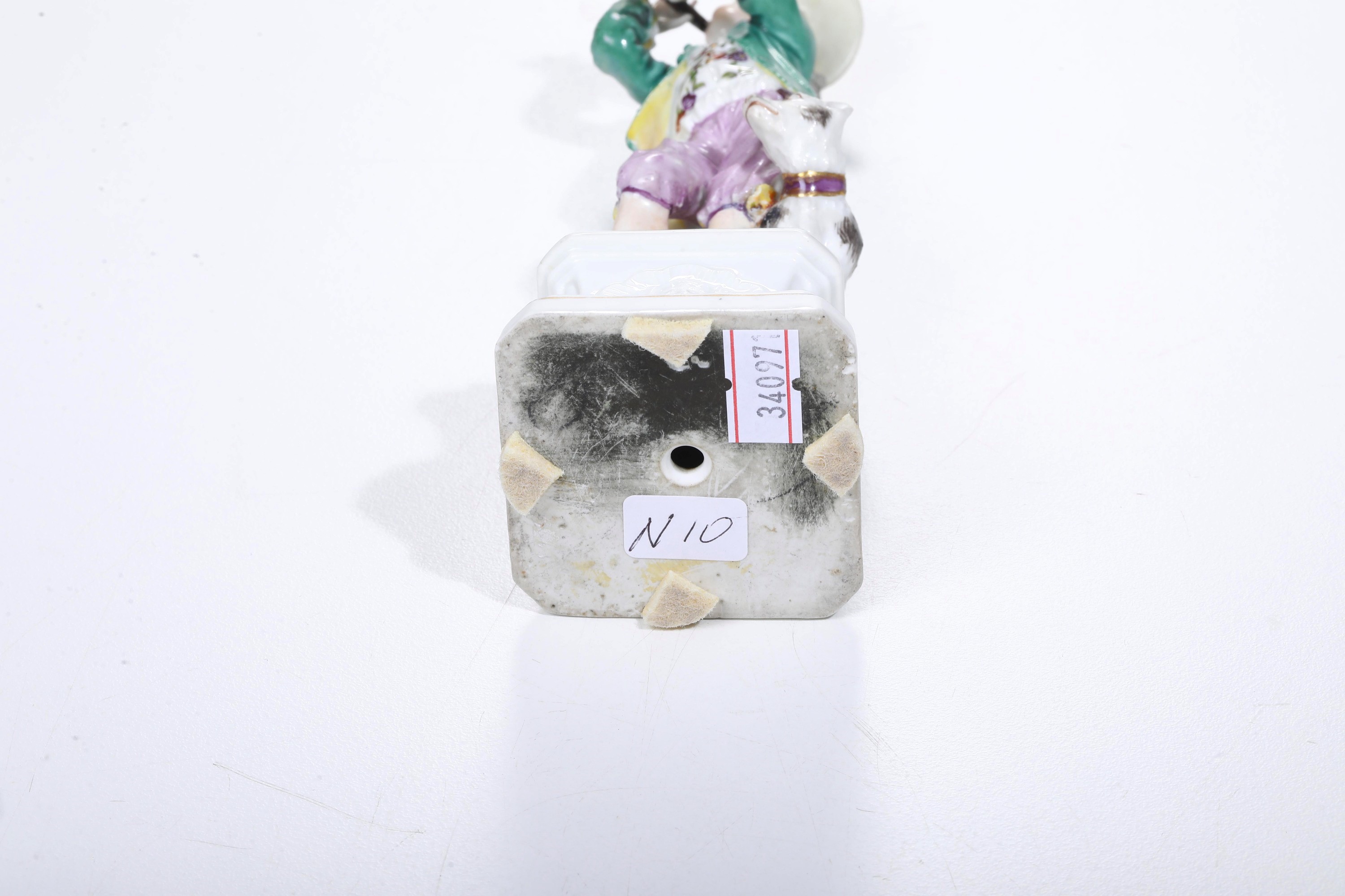 Porcellana. Marca: spade in blu dietro la base. Altezza cm 18,3. Conservazione: rotta e ricomposta in restauro all’altezza delle gambe, alla congiunzione con il cane, alla parte inferiore della giacca, al piffero, alle mani e al cappello
