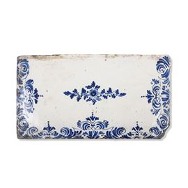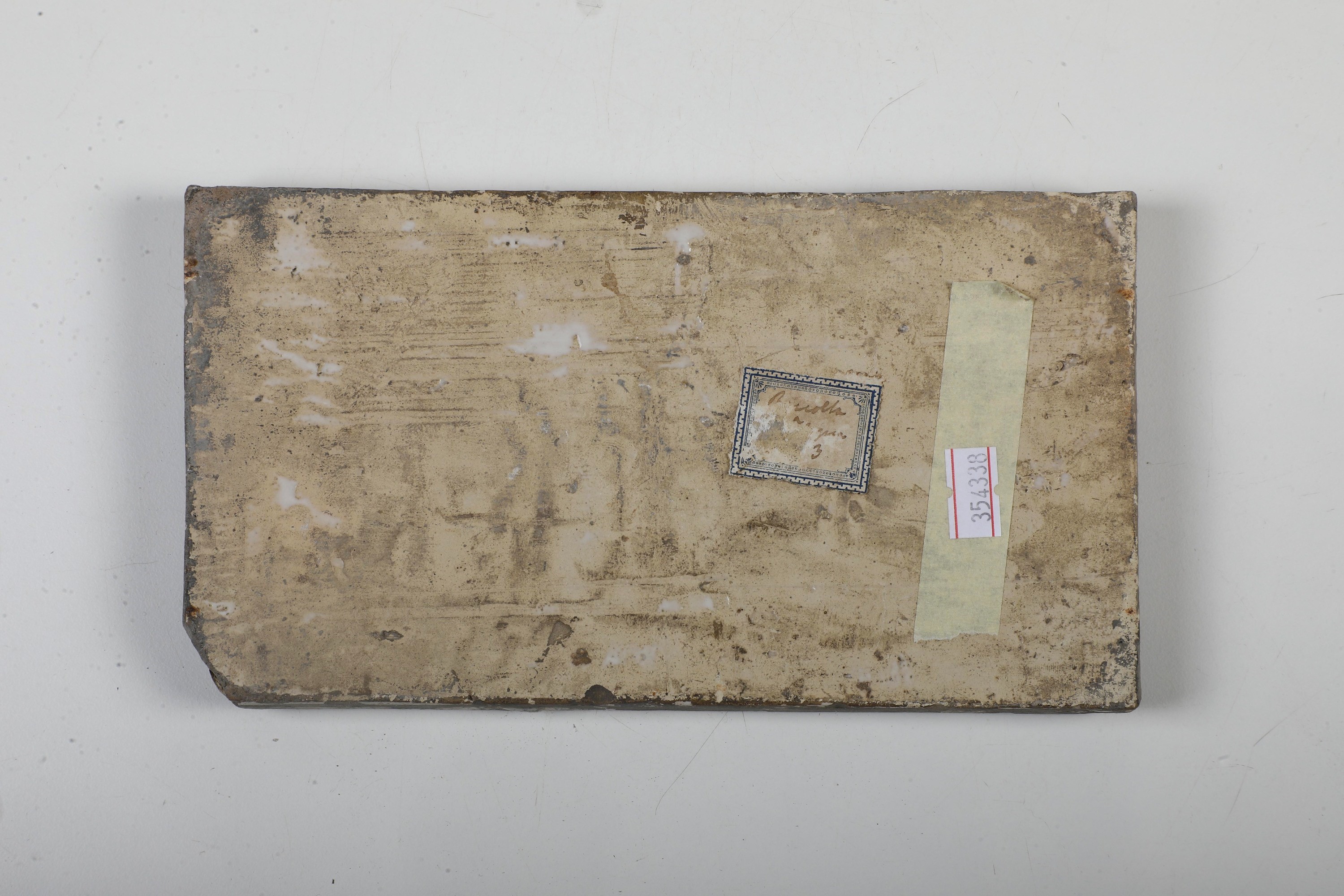 Terracotta smaltata. Dimensioni: spessore cm 0,5; cm 12x22. Conservazione: piccole mancanze e salti di smalto ai bordi