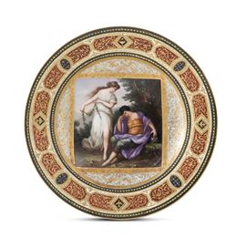 Il piatto è decorato alla maniera della Manifattura Imperiale di Vienna, periodo della direzione di Conrad von Sorgenthal.