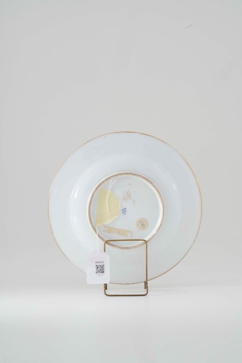 Porcellana policroma e dorata. Marca: pseudo marca di Vienna con scudo in blu. Diametro cm 24,5. Conservazione: ottima