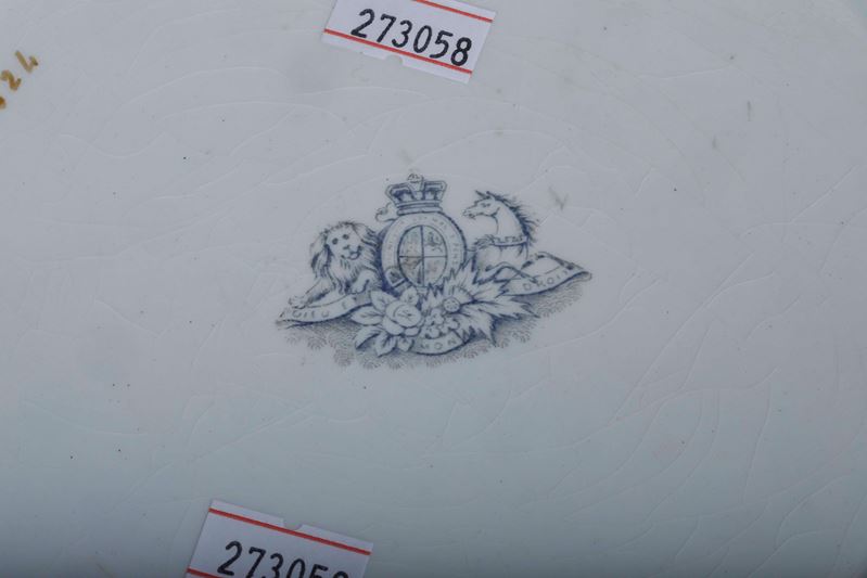 Terraglia. Marca: stemma coronato con leone e unicorno e le scritte "Dieu et mon Droit" "honi soit qui mal y pense"