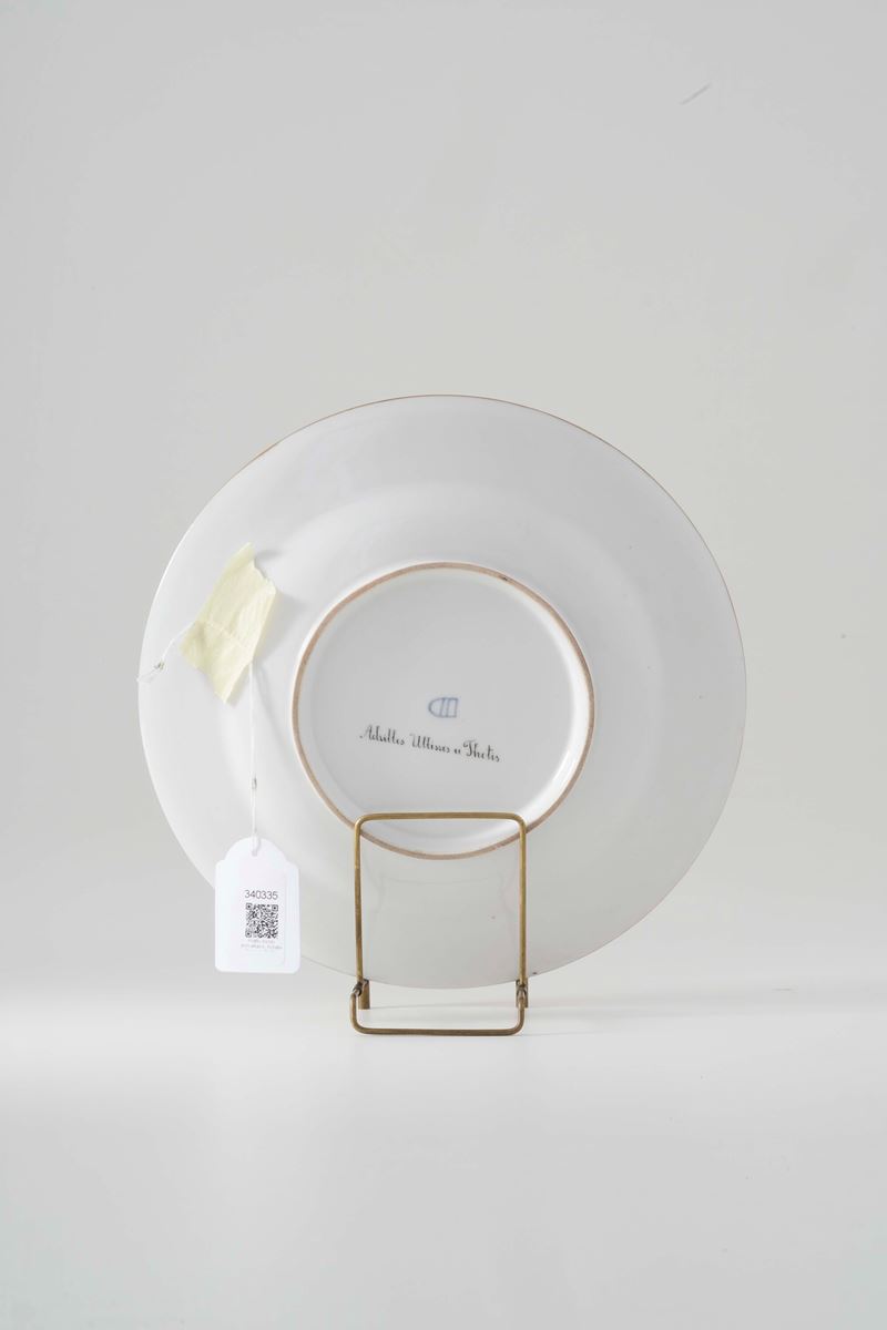 Porcellana policroma e dorata. Marca: pseudo marca di Vienna con scudo in blu. Diametro cm 24,2. Conservazione: ottima
