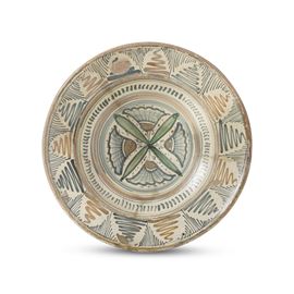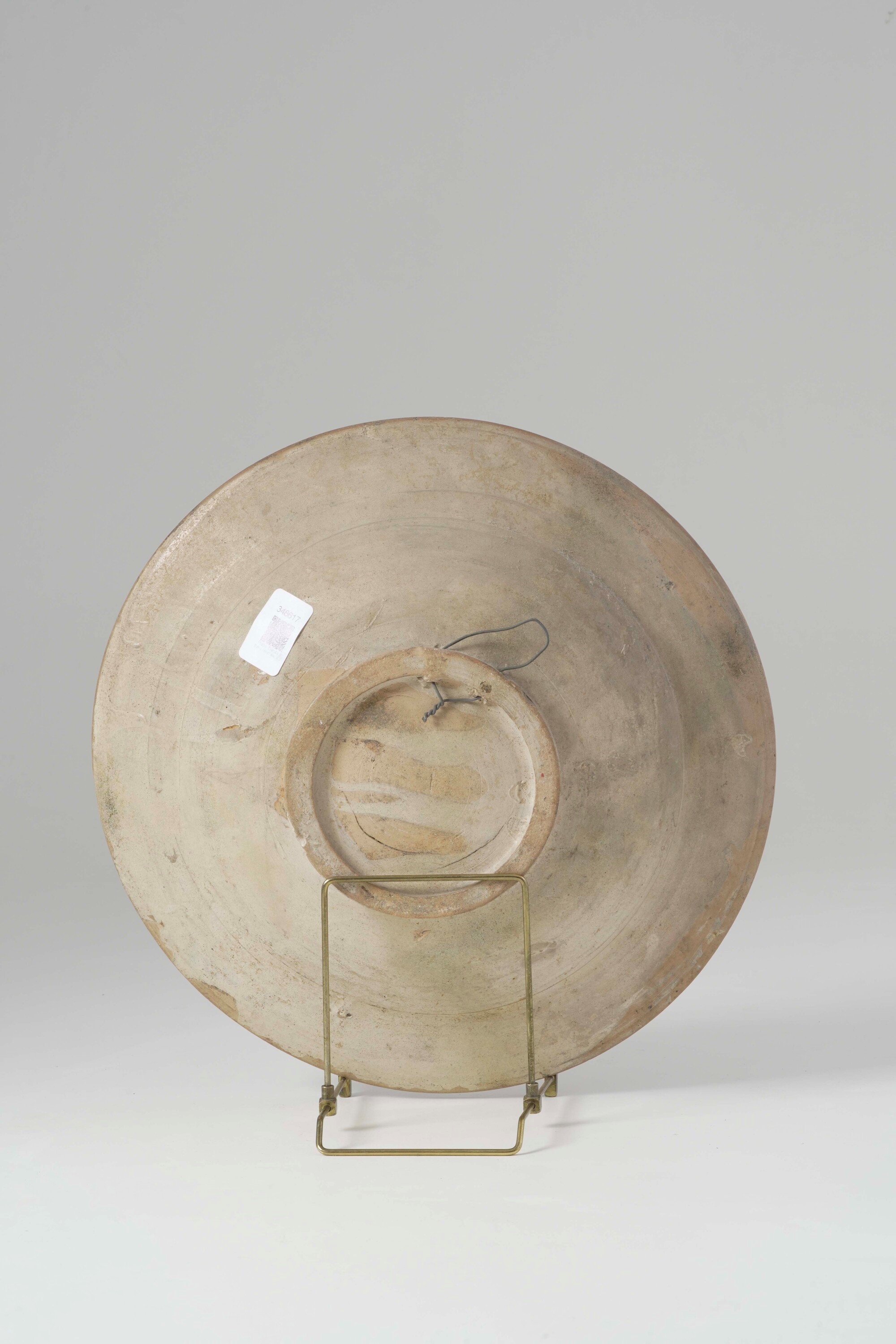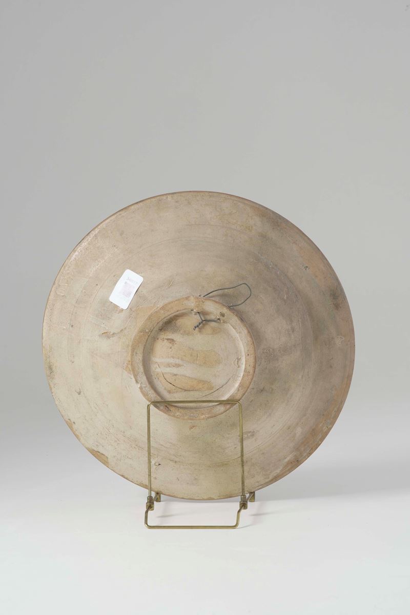 Maiolica. Dimensioni: altezza cm 7,5 circa; diametro cm 33,5. Conservazione: salti di smalto, specialmente ai bordi