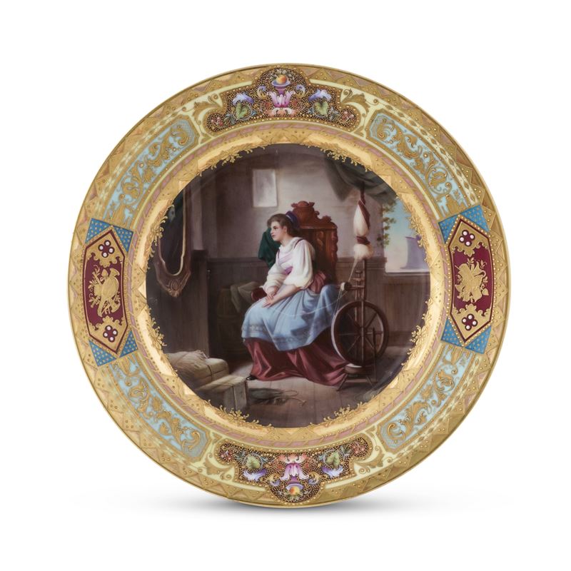 Il piatto, alla maniera di Vienna, raffigura "Senta al filatoio" ed è ispirato alla scena centrale del secondo atto dell'opera di Richard Wagner "Il vascello fantasma", nota anche come "L'olandese volante", composta nel maggio del 1840 e eseguita per la prima volta a Dresda nel 1843.