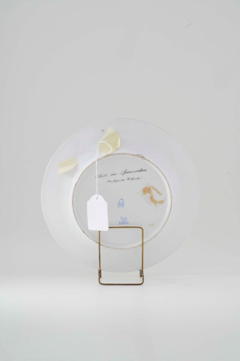 Porcellana. Marca: pseudo marca di Vienna e simbolo grafico con agnello e “Dresden”. Diametro cm 24,2. Conservazione: ottima