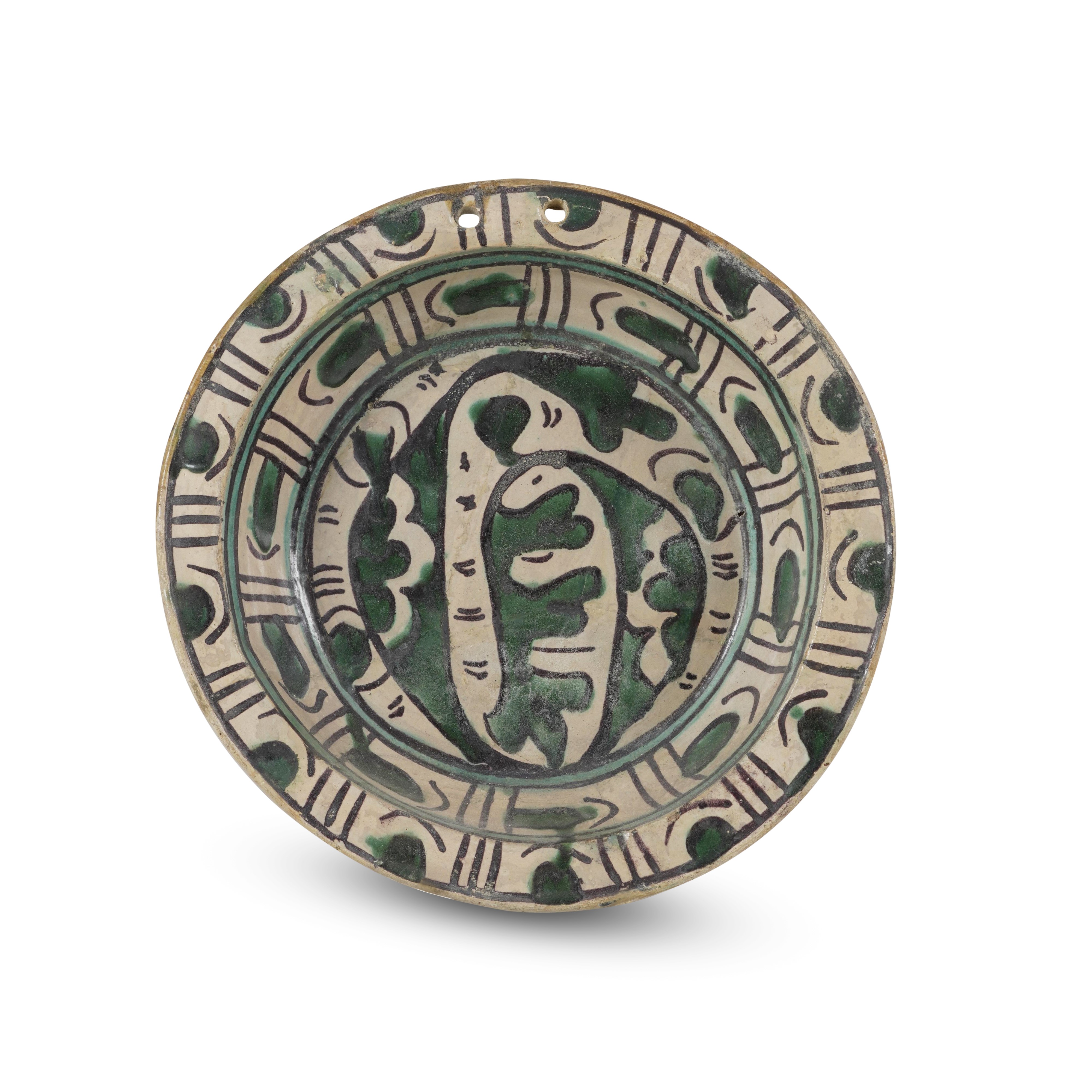La foglia di quercia stilizzata, dipinta al centro dell’iniziale, e le bacche attorno, in verde applicato a rilievo, che caratterizzano la decorazione di questo piatto possono dirsi piuttosto comuni in area centro-italiana, specie laziale. Tuttavia la qualità dello smalto, l’assenza dello stesso sul verso e il repertorio epigrafico-fitomorfo in bicromia, innestato sulla precedente tradizione “arcaica”, fanno di questo piatto un saggio tipico della produzione centro-italiana della prima metà del Quattrocento, che in parallelo vede, con la Romagna, lo sviluppo della maiolica in “zaffera a rilievo”. Per circoscrivere l’area di produzione, si segnala che la stessa tematica epigrafico-fitomorfo in bicromia verde e bruno, è riscontrabile su un boccale coevo di produzione orvietana, rinvenuto nel pozzo medievale di Campo della Fiera a Orvieto1