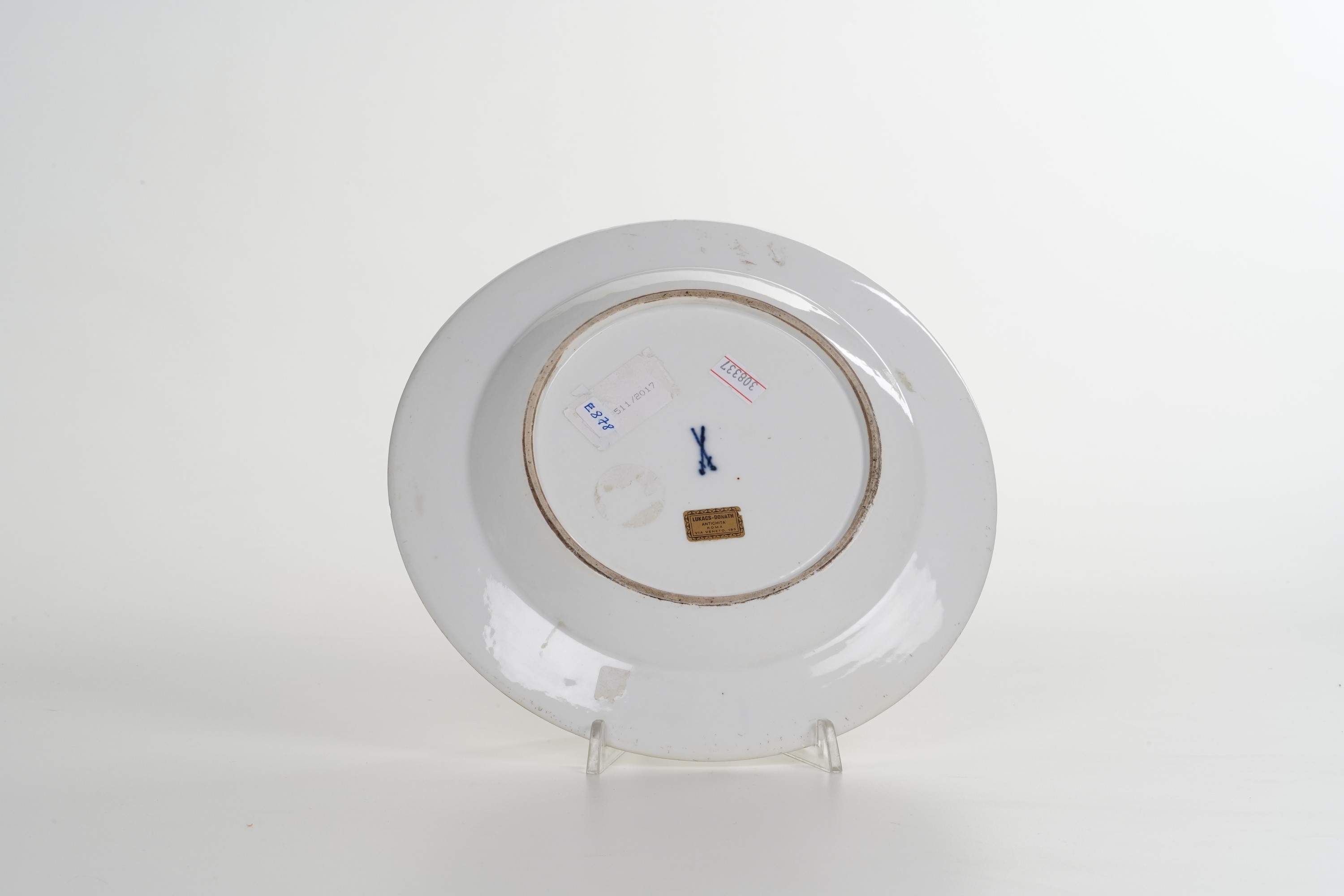 Piatto dalla tesa liscia decorato nel cavetto con una riserva quadrilobata incorniciata da un elaborato “Laub- und Bandelwerk” (ossia “a foglie e nastri”) in oro. In un ampio paesaggio una coppia di nobili è a passeggio in riva ad un fiume con un barcone da trasporto e, sullo sfondo, edifici e monti. La tesa ospita quattro ramoscelli di fiori recisi con la loro ombra detti “Holzschnittblumen” e insetti sparsi. Questi tipici fiori nascono a Meissen verso il 1737 e sono in voga fino al 1745. Copiati dagli erbari e dai libri di botanica, spesso sono frammisti ad insetti, eseguiti nello stesso stile, anch’essi copiati dalle pubblicazioni scientifiche