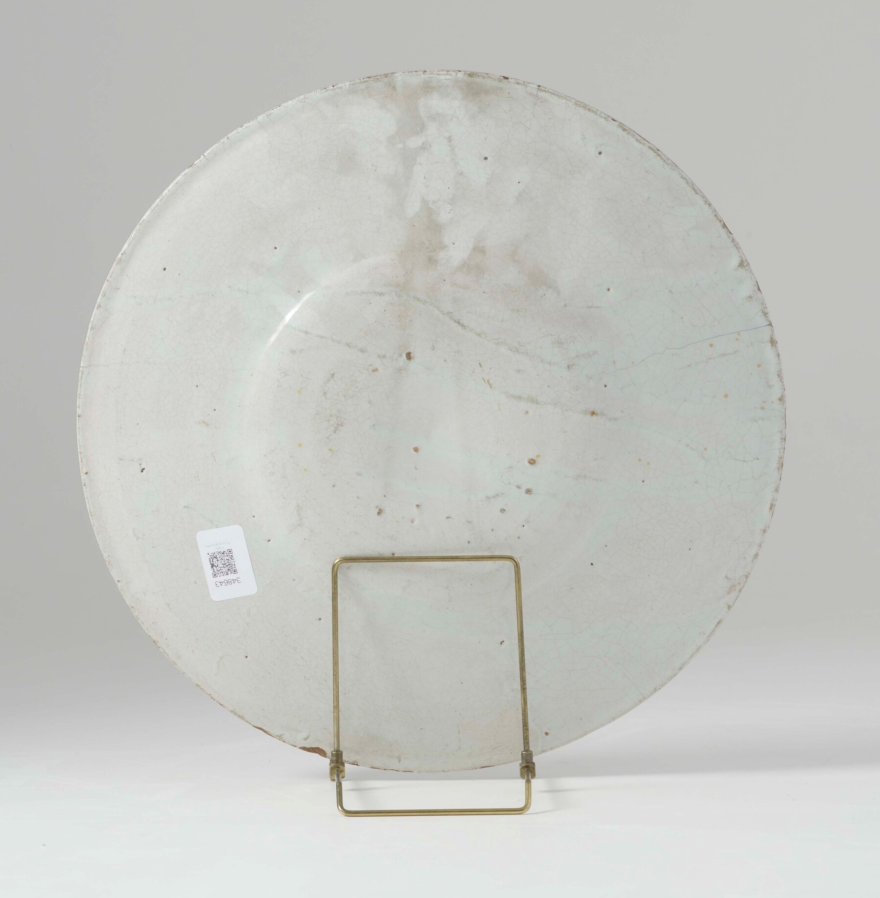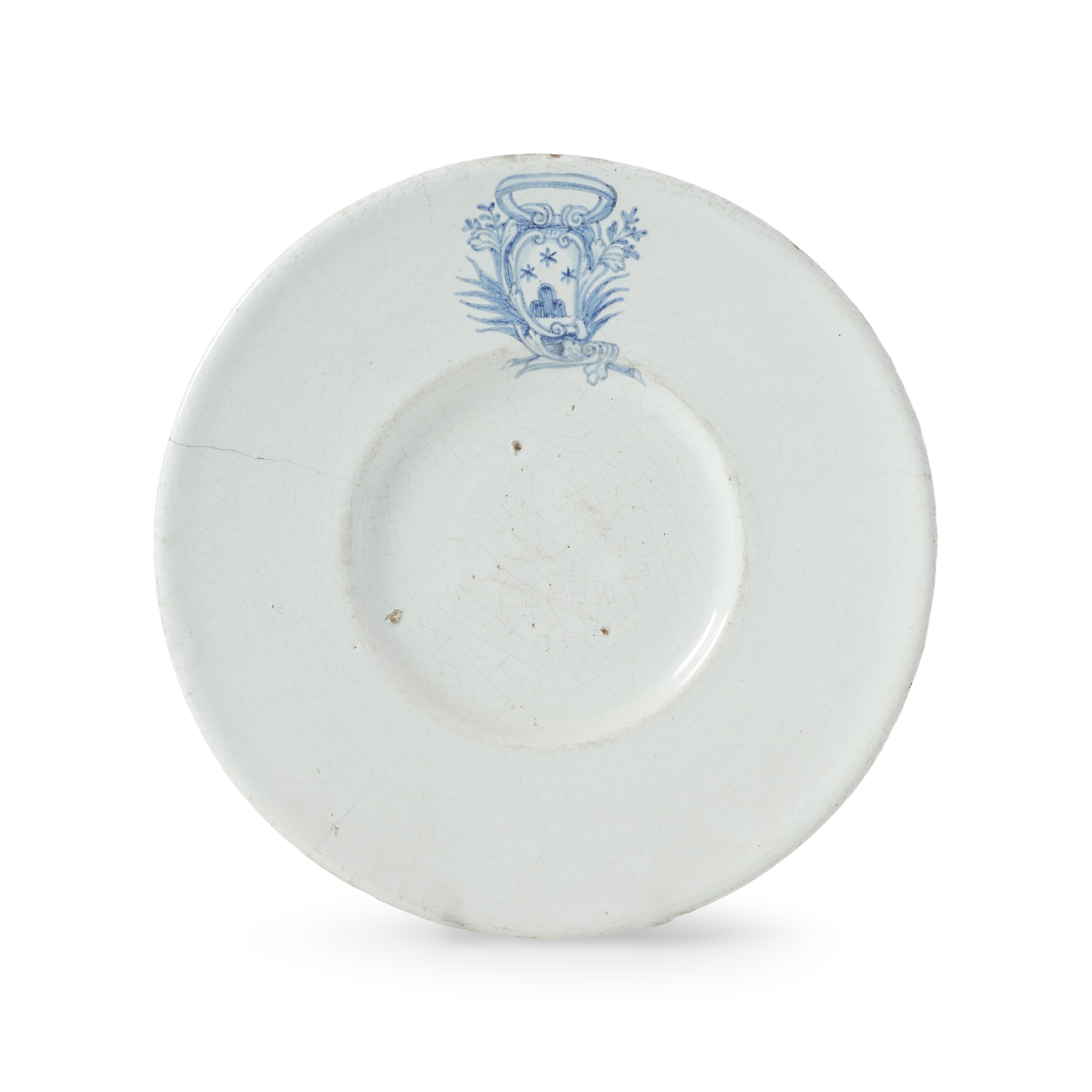L’opera mostra tipica foggia settecentesca, cioè senza piede e integralmente smaltata. Anche la fattura elegante dello stemma e gli ornamenti che lo arricchiscono sono tipicamente settecenteschi, mentre la positura dello stemma è mutuata dai piatti coevi in argento. Circa l’identificazione dello stemma, si ipotizza prudentemente quello della famiglia lombarda Monticelli (1). Ancora maggiore cautela è richiesta circa la possibile fabbrica che lo ha prodotto. Infatti, l’assenza di aspetti decorativi complementari allo stemma e la fattura canonicamente settecentesca dello stesso, rendono difficile poterne riconoscere con certezza il luogo di esecuzione. Tuttavia l’origine della famiglia e soprattutto la qualità dello smalto, di grana fine e di spessore coprente, ancora memore dei “bianchi” italiani secenteschi, fanno propendere per una fornace dell’Italia settentrionale