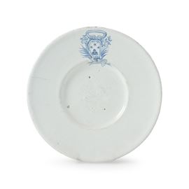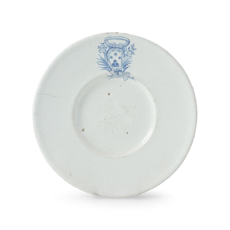 Piatto da portata, apodo, con basso cavetto e ampia tesa orizzontale. In un punto della tesa è dipinto, in monocromia blu, uno scudo araldico a cartoccio e punta piegata, ornato ai lati con palme, racemi fogliati e nastro (o cartiglio) alla sommità