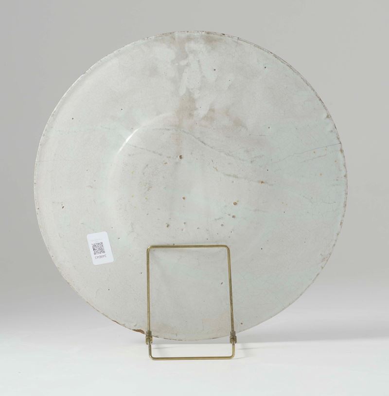 Maiolica. Diametro cm 37. Conservazione: ottima; felatura sulla tesa alle ore 10; insignificanti sbeccature al bordo