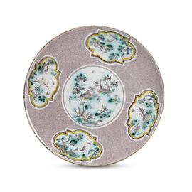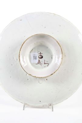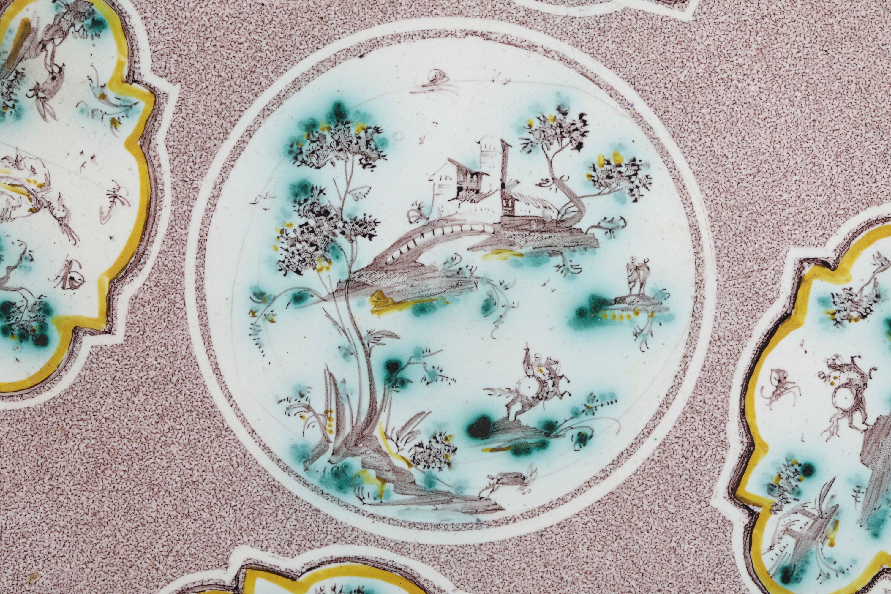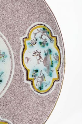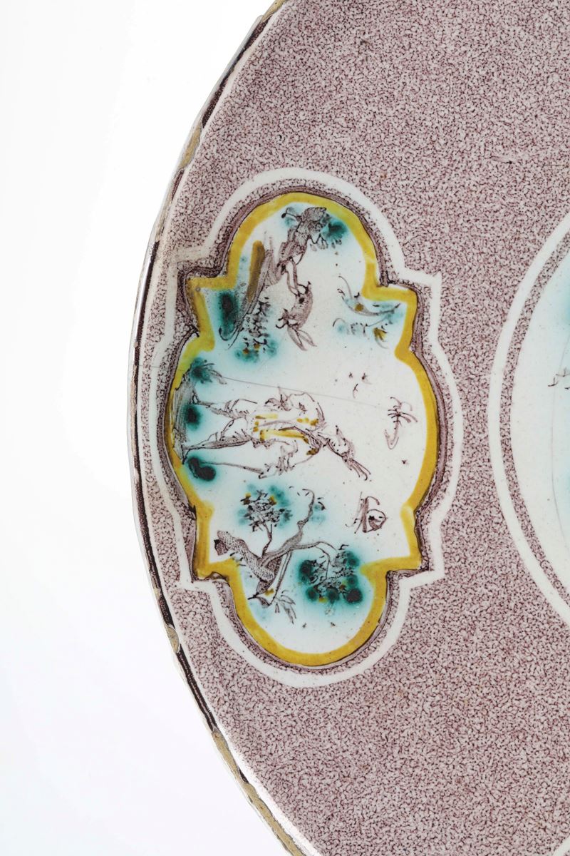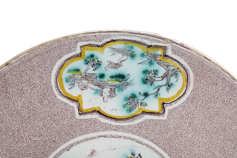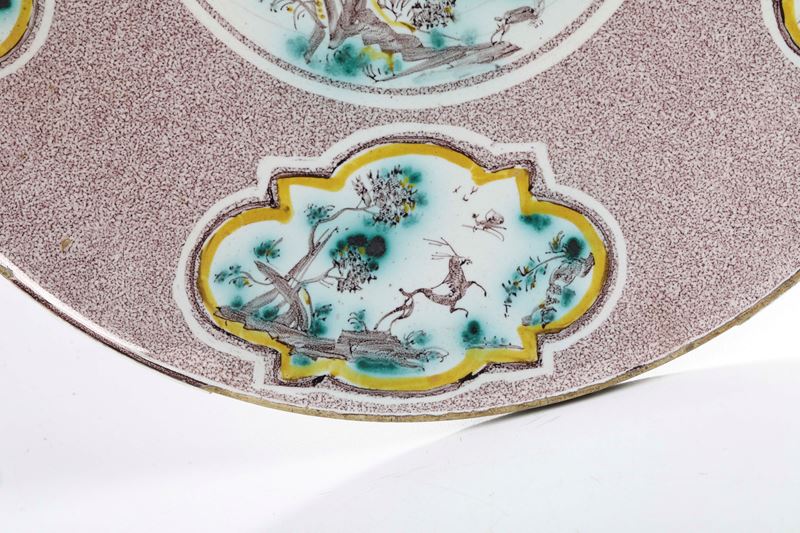Dal bordo liscio è decorata in spugnato di manganese con cinque riserve che ospitano paesaggi con figuretti, cavalieri, selvaggina, casolari, alberi, uccelli ed insetti in volo dipinti in manganese, verde e ocra