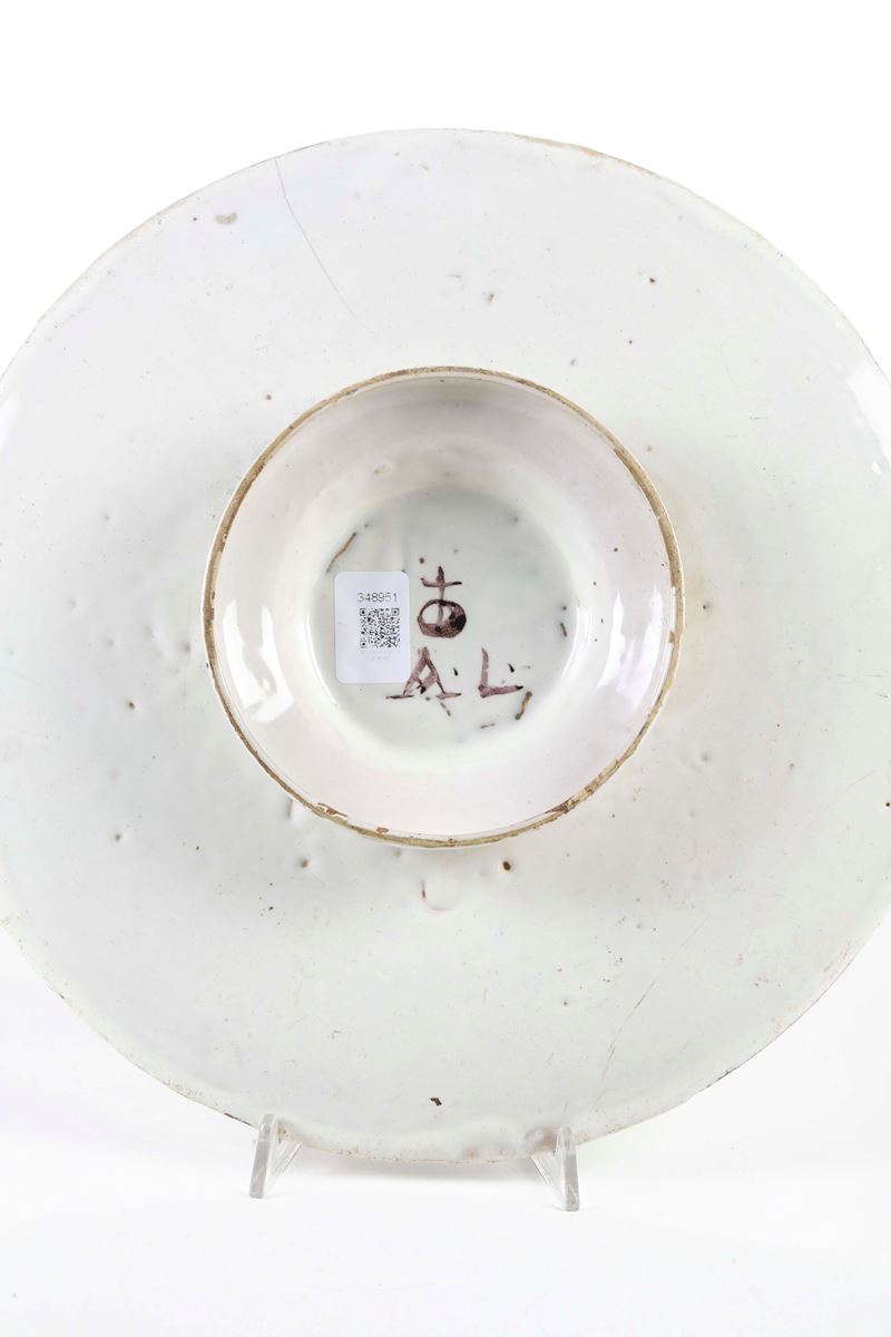 Maiolica. Marca: globo crocifero e “AL” in manganese. Dimensioni: altezza cm 5,5 circa; diametro cm 35,5. Conservazione: ottima; mancanze di smalto al bordo; due insignificanti felature