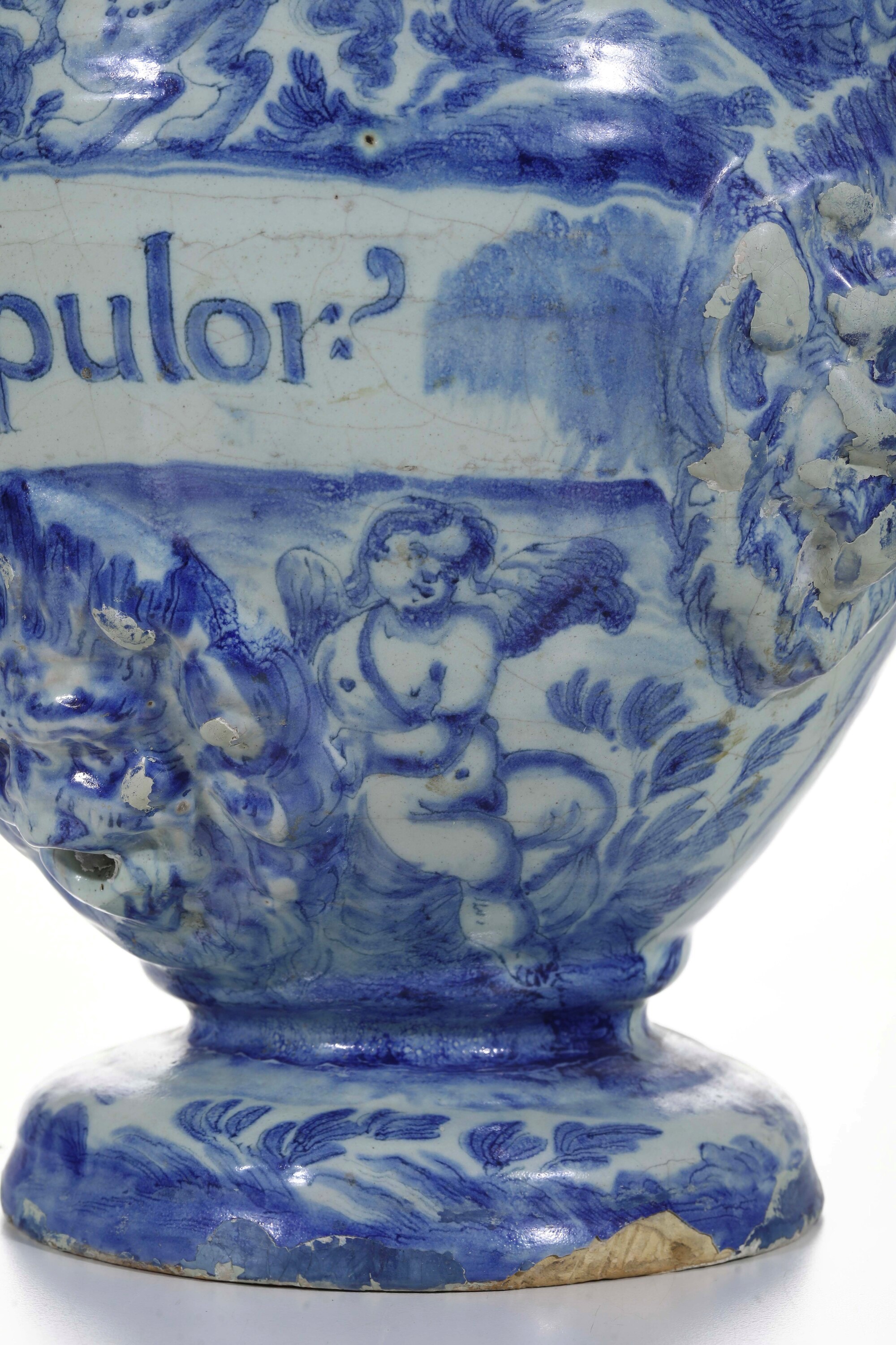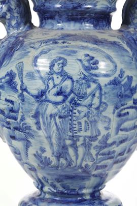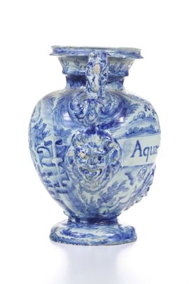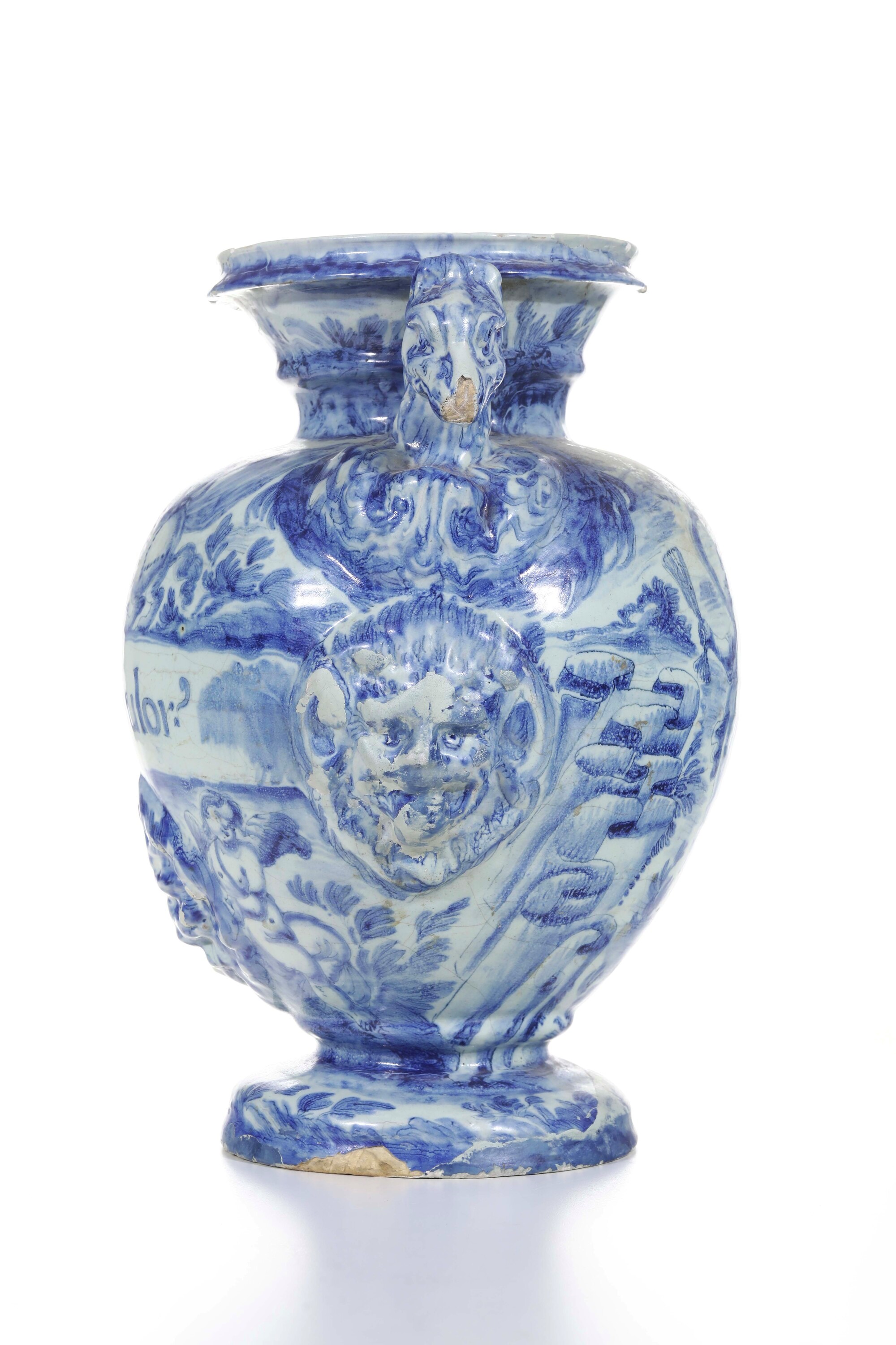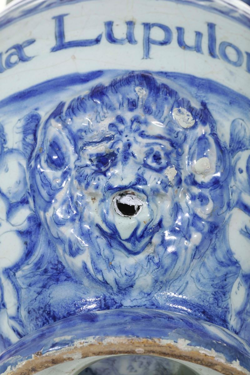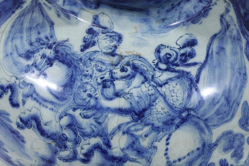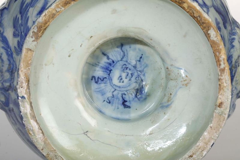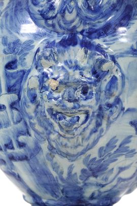 Maiolica. Marca: sole raggiante. Altezza cm 41 circa. Conservazione: mancanze integrate al bordo superiore e inferiore; cadute di smalto e sbeccature ai mascheroni e alle prese, in parte restaurate.