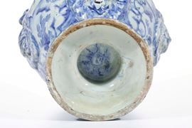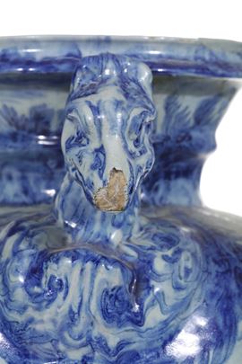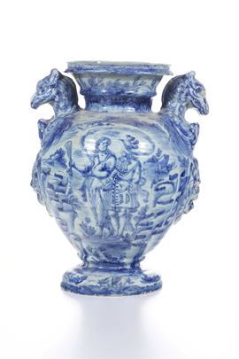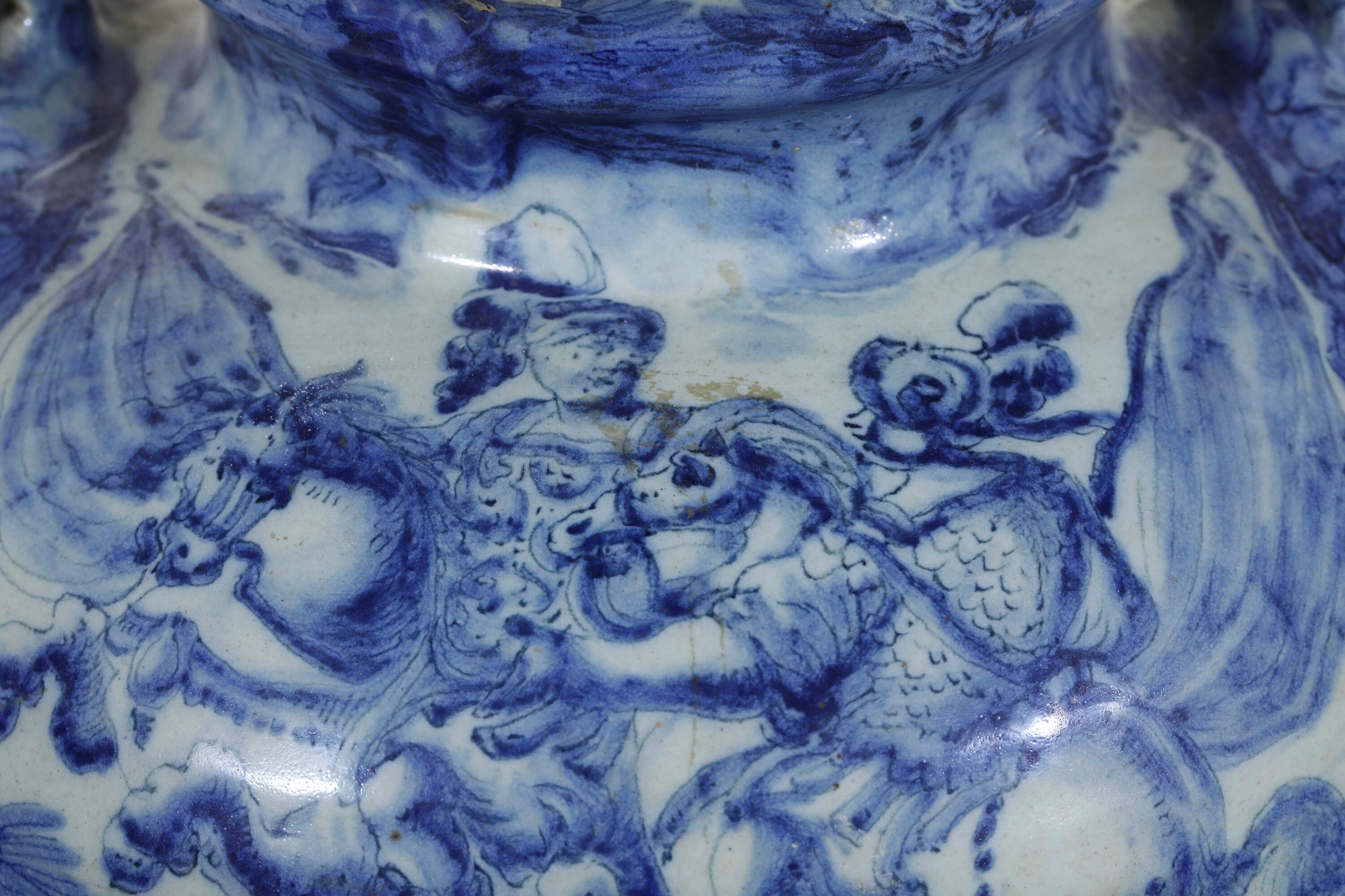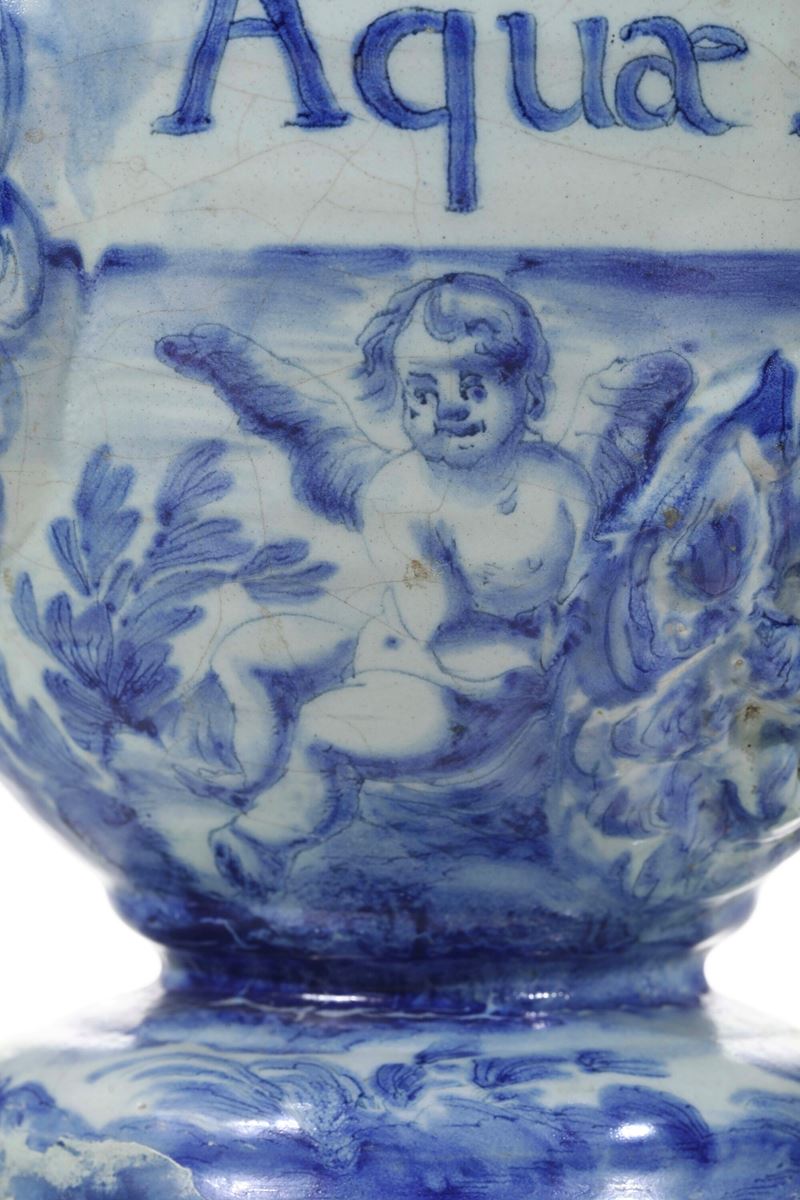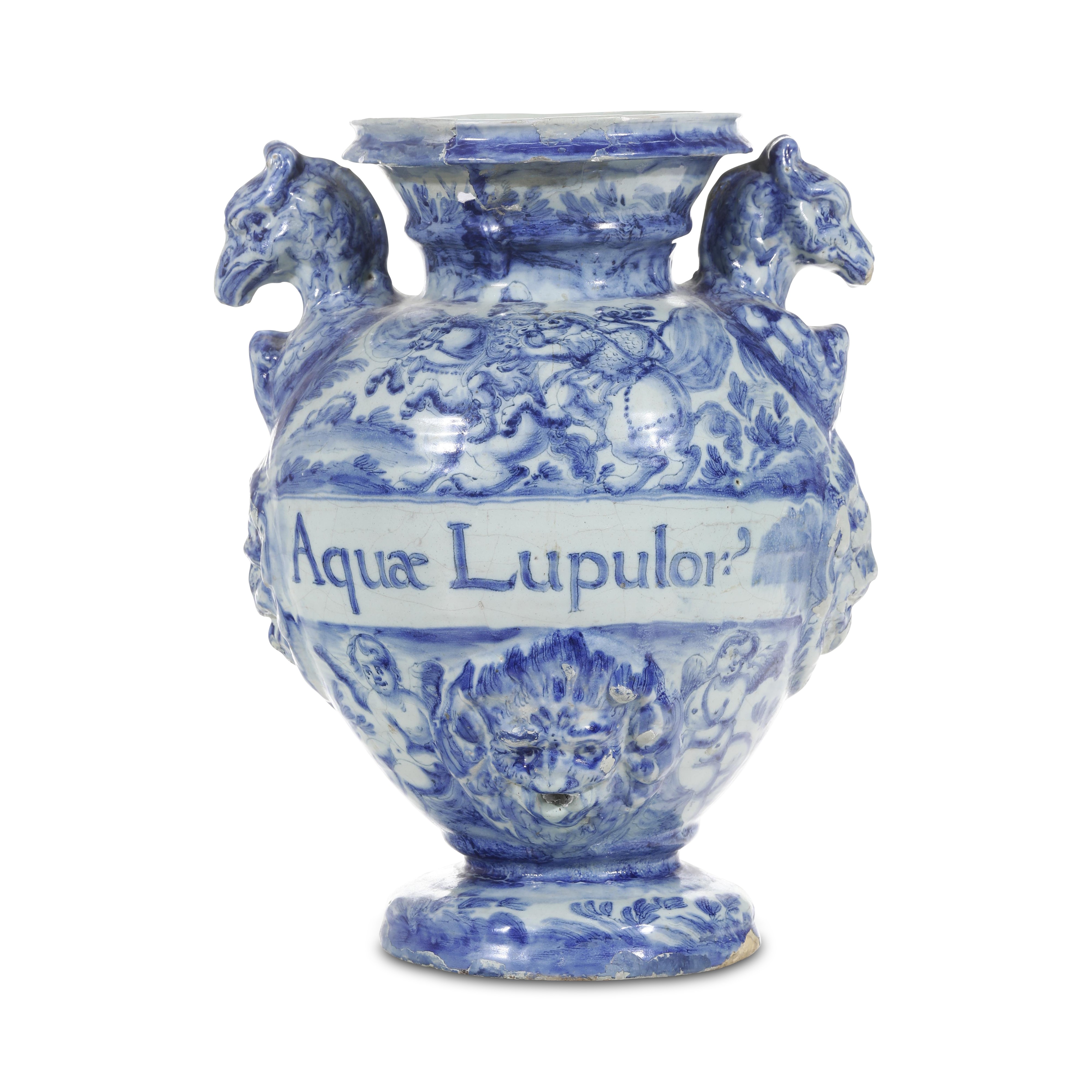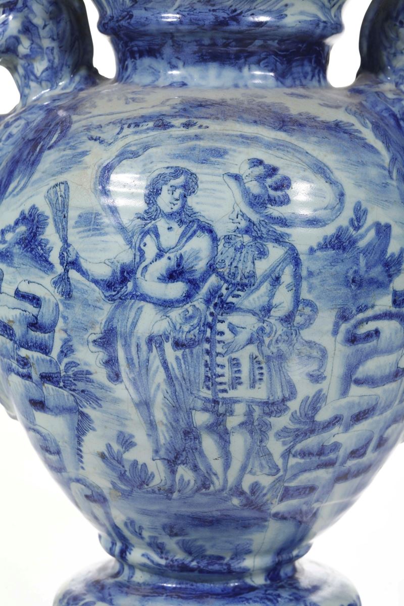Maiolica. Marca: sole raggiante. Altezza cm 41 circa. Conservazione: mancanze integrate al bordo superiore e inferiore; cadute di smalto e sbeccature ai mascheroni e alle prese, in parte restaurate.