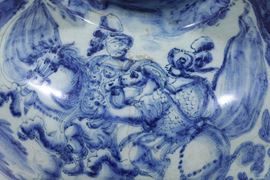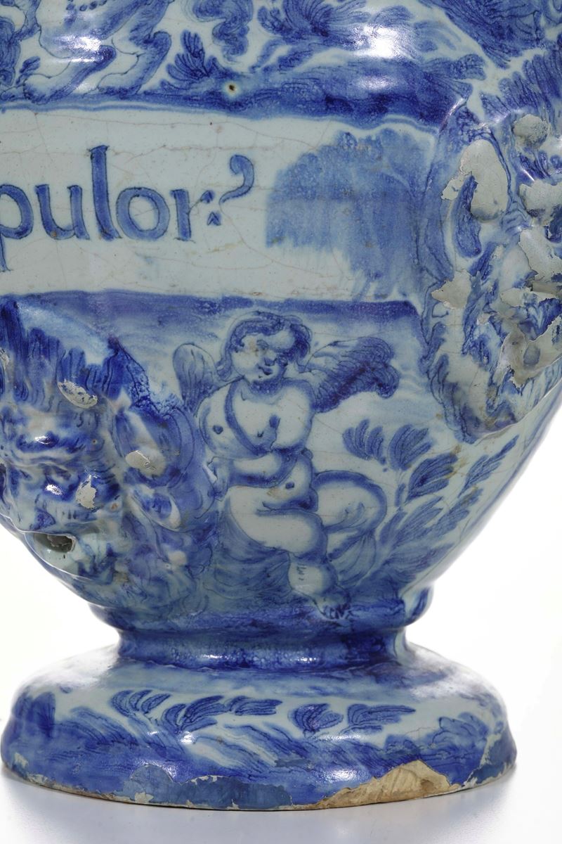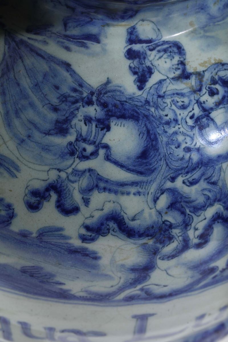 Sulla superficie anteriore, al di sopra del cartiglio, sono dipinte le figure di due cavalieri, vessilli al vento, che procedono quasi affiancati al galoppo. Questo particolare soggetto dei guerrieri armati all’antica, espresso in diverse varianti riconducibili al medesimo tema, può considerarsi presente nell’iconografia della maiolica ligure dalla metà del settimo decennio del XVII secolo, testi le maioliche savonesi prodotte per i Medici, proponendosi almeno fino al nono decennio compreso: prova ne sono fra gli altri numerosi esempi la decorazione di uno stagnone databile al 1680 (1), quelle dello stagnone e dell’albarello della farmacia del convento di San Salvatore a Gerusalemme, databili a metà o verso la fine del nono decennio (2), quella di uno stagnone ascrivibile a tale periodo (3).