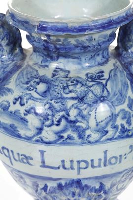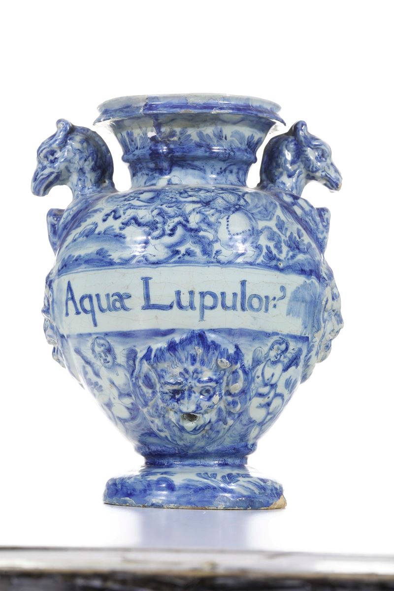 Il cartiglio epigrafico si estende sulla superficie anteriore dello stagnone, all’altezza dei mascheroni, e assiepa le sue numerose plicature finali sulla superficie posteriore, badando a mantenere sgombra la parte centrale dello spazio destinato a ospitare la figurazione di maggiore censo artistico. Il medicinale contenuto sono le “Aquae Lupulor*”, Aquae Lupulorum, acque di luppoli, un’ “Acqua Officinale Temperata”, ovvero moderata nel dispensare il proprio effetto terapeutico sedativo, esente dalla necessità di contrastarne parti avverse insite.