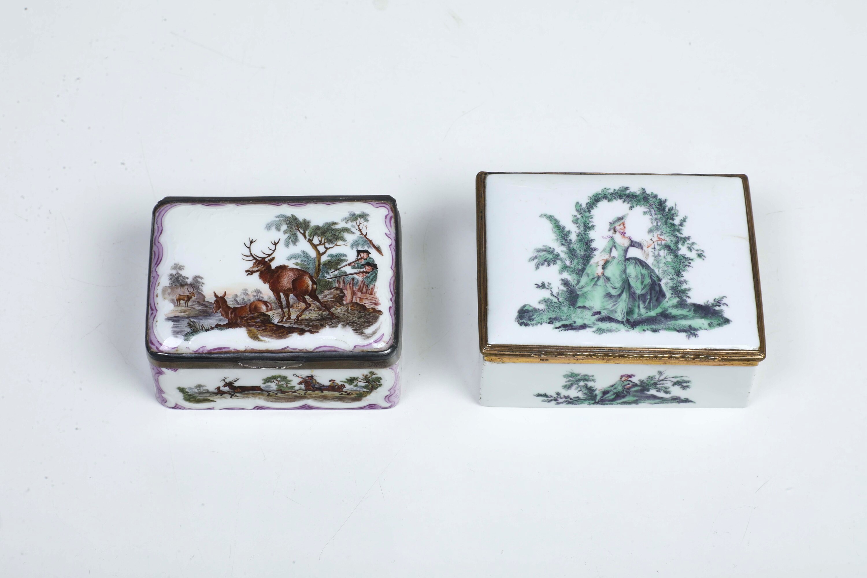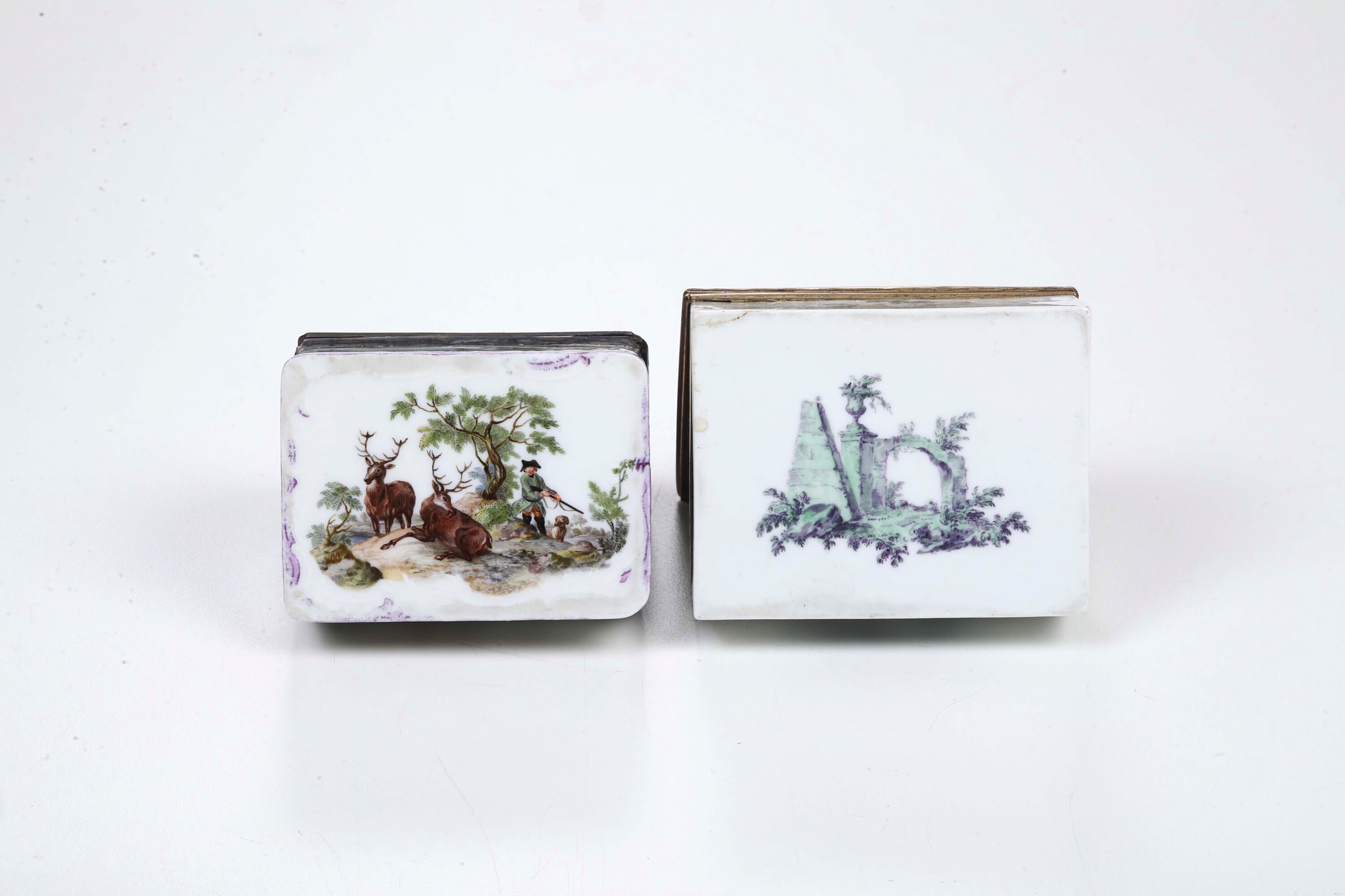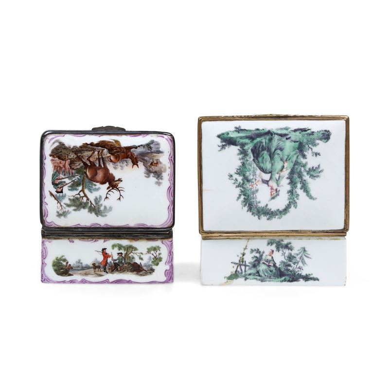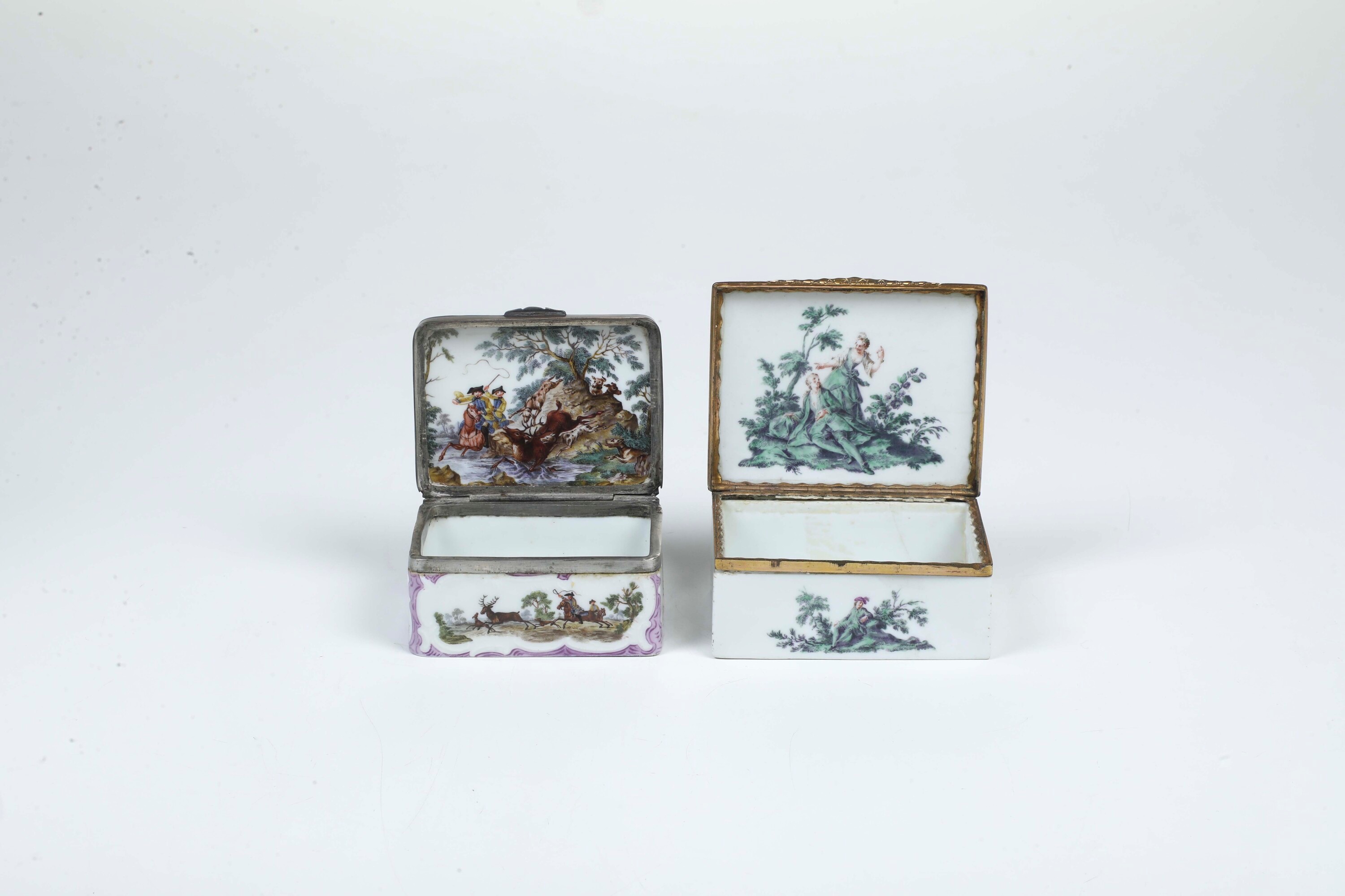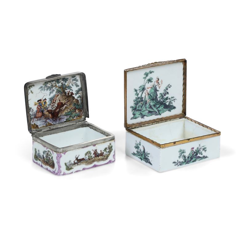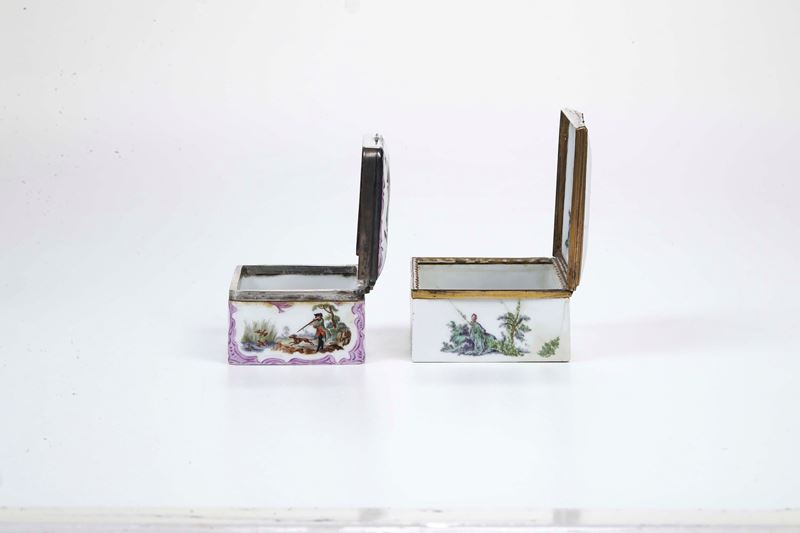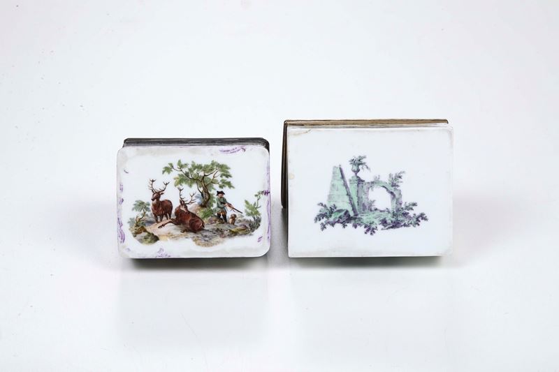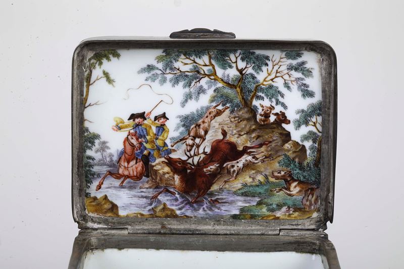 Al lotto si aggiunge una tabacchiera del XIX secolo decorata in policromia con scene di caccia (dimensioni: altezza cm 3,9; cm 8,2x6,3. Conservazione ottima)