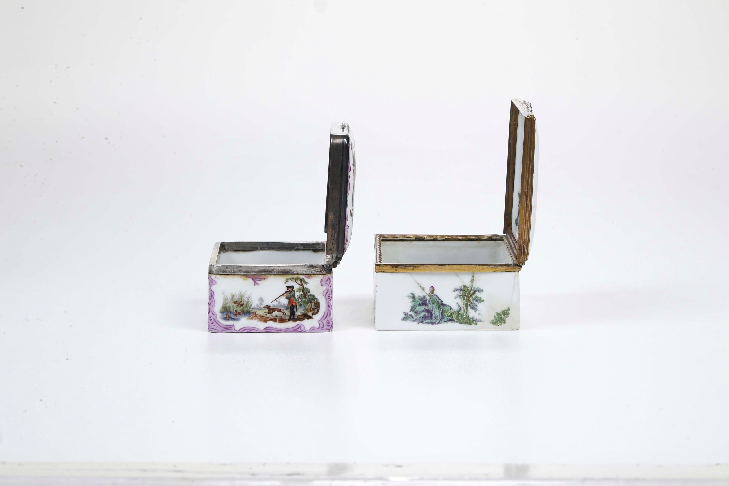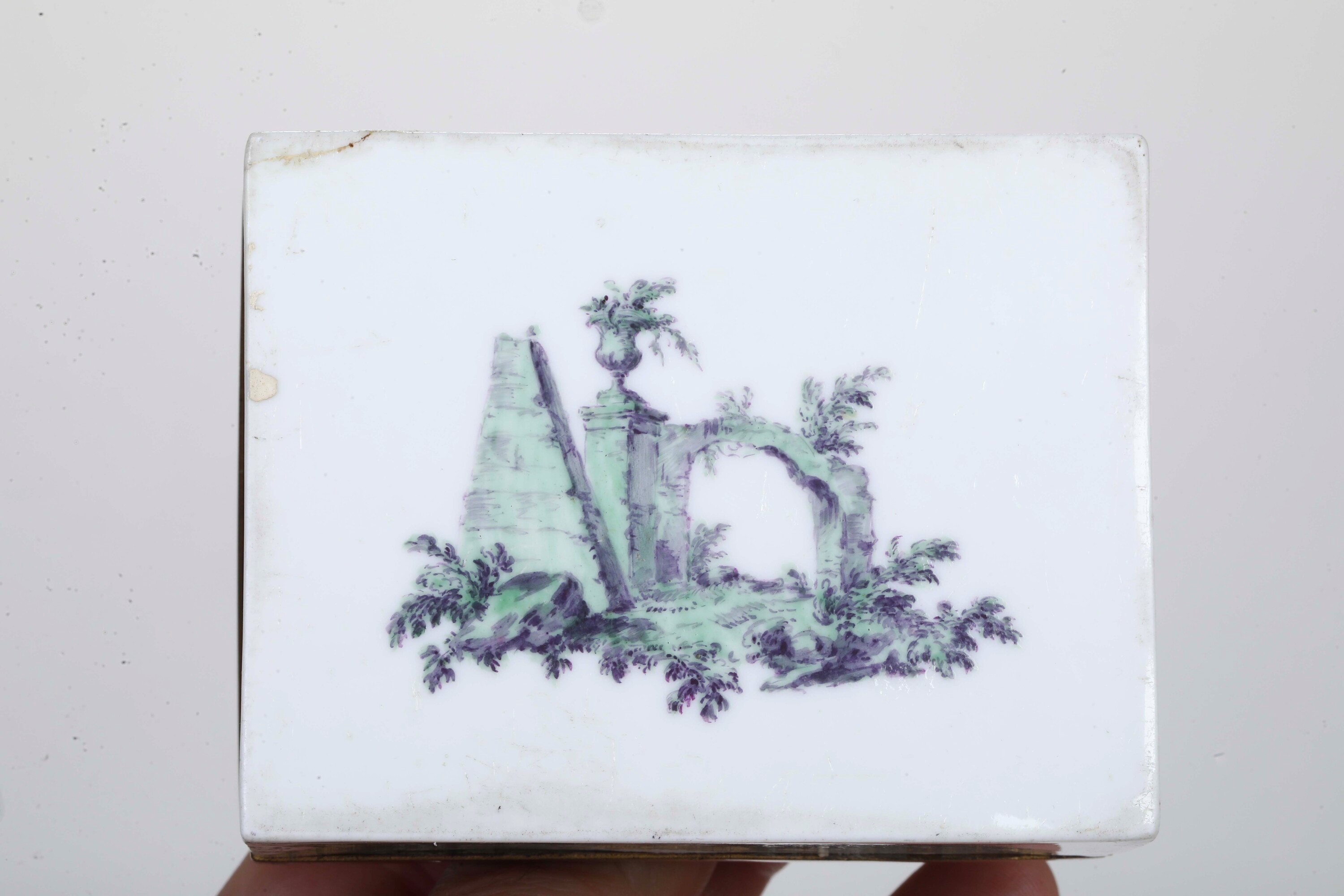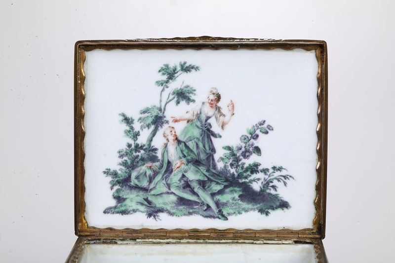 Porcellana. Marca: assente. Dimensioni: altezza cm 4; cm7,2x 9. Conservazione: rotture ricomposte alle pareti frontale e laterale destra; piccola e insignificante felatura sul coperchio. Montatura in metallo dorato
