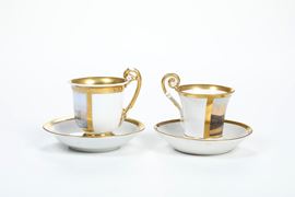 Porcellana. Marca: scudo bavarese impresso. Dimesioni: altezza tazza cm 8,4; diametro piattino cm 13. Conservazione: ottima