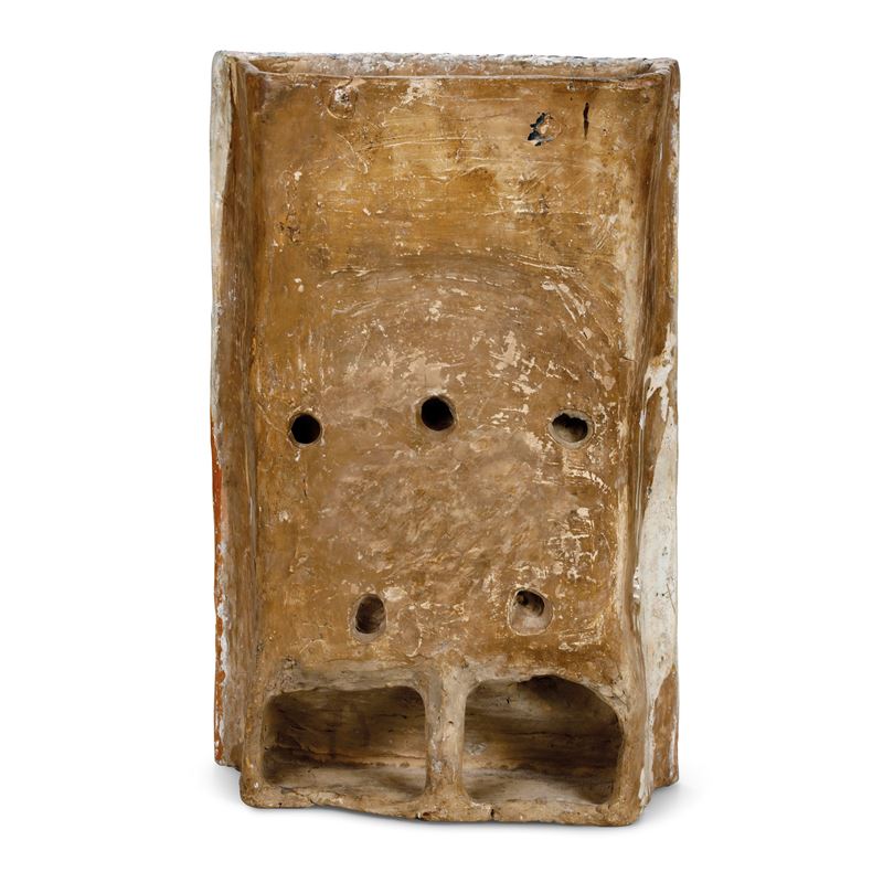Grande pannello rettangolare, includente una capsa centinata, delimitata da un tralcio vegetale che si sviluppa alla sommità in un grande trifoglio e in due ampie girali fogliate ai lati; all’interno della cavità, a basso ed alto rilievo, è modellato un “Presepe”, distribuito su due registri: in alto l’annuncio ai pastori e in basso la Natività (Fig. a). Il retro, lasciato grezzo, presenta una struttura con fori e doppia cavità per stabilizzare le fasi di lavorazione dell’opera, specie l’essicatura e la cottura (Fig. b). Dipinta in arancione, blu, giallo e verde.