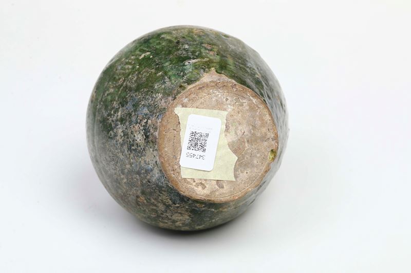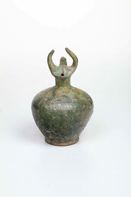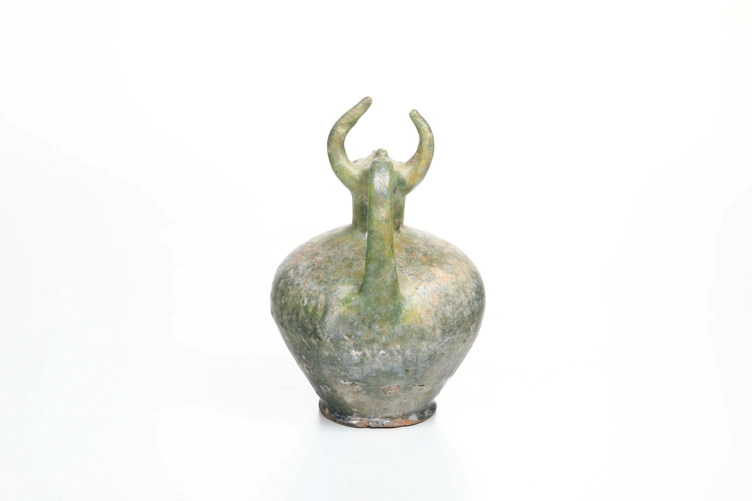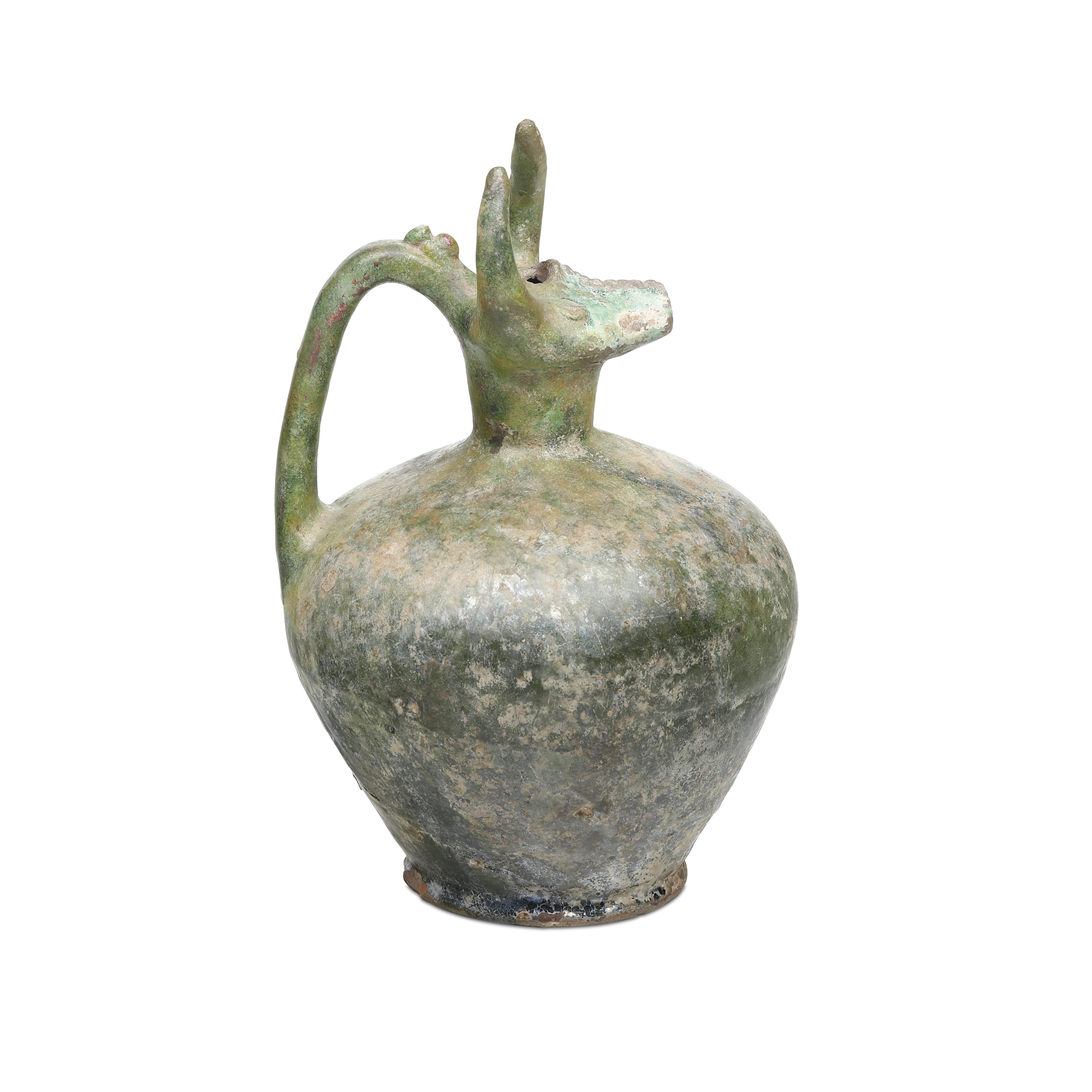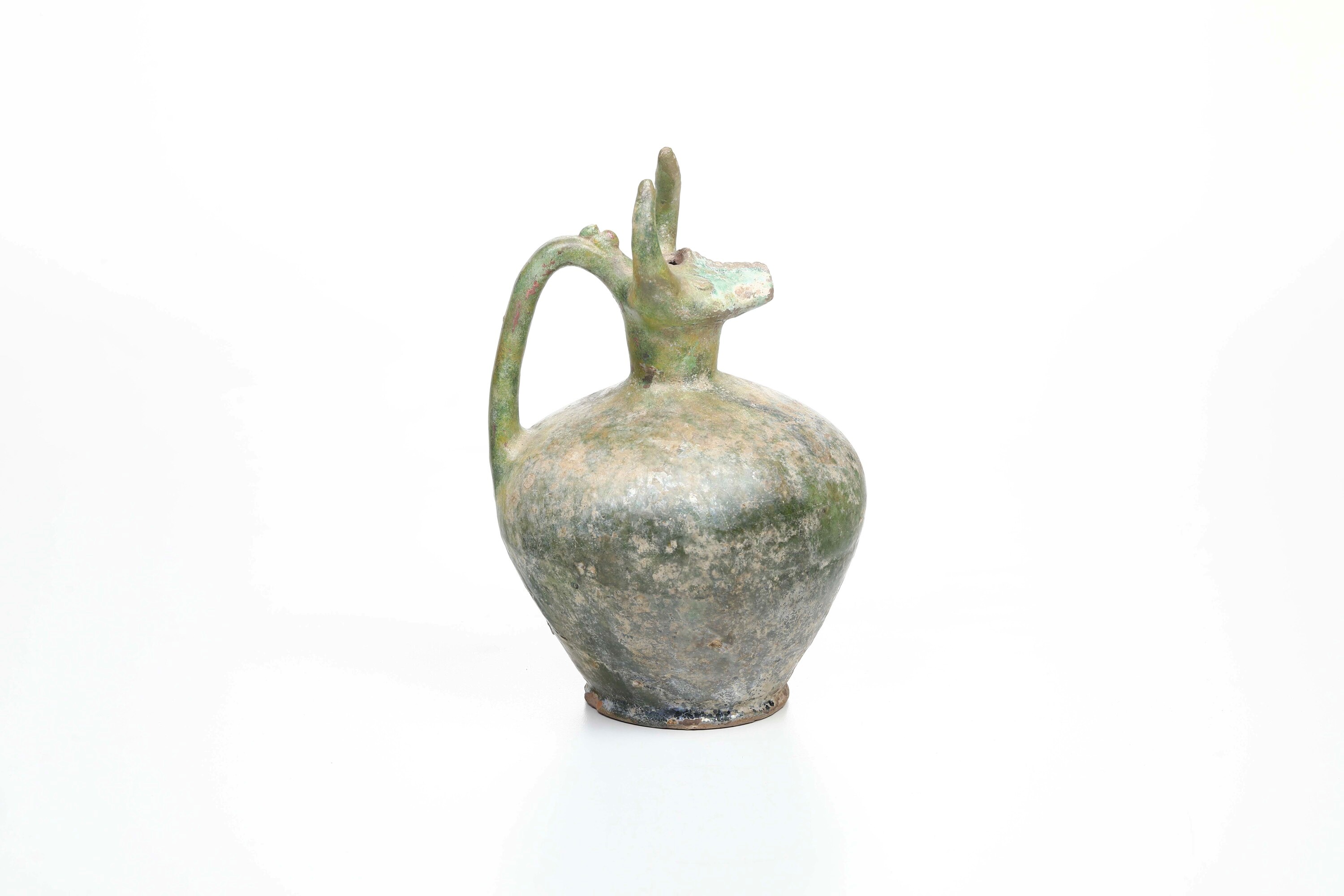 La brocca, dal corpo globulare e con l'estremità superiore modellata a forma di testa di toro, è stata realizzata a stampo e ricoperta di invetriatura verde. Le teste taurine sono frequenti in questo periodo, soprattutto negli oggetti metallici, e si ipotizza che abbiano un simbolismo astrologico (Toby Falk, Treasure of Islam, catalogo della mostra, New Jersey, 1985, p. 233)