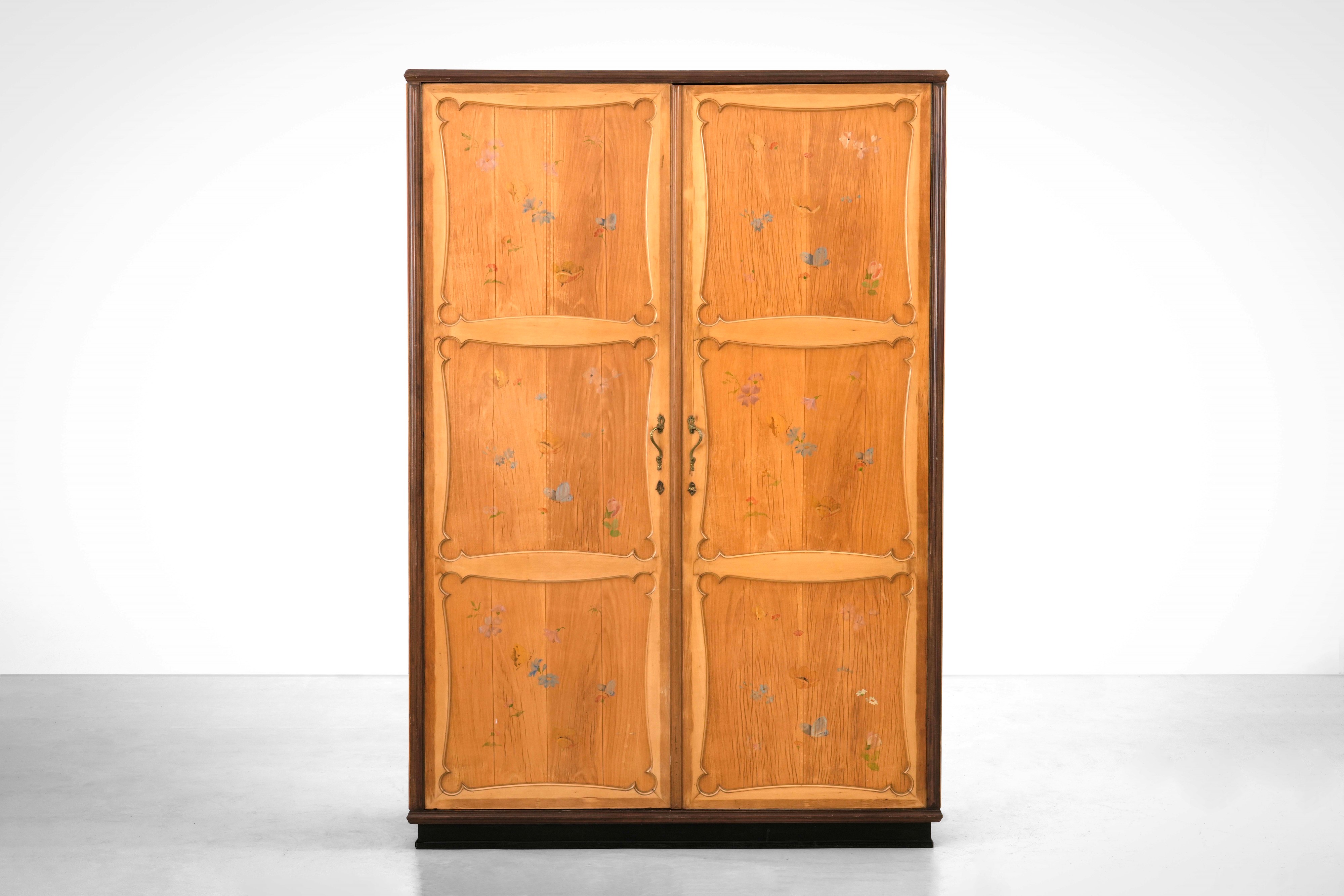Struttura in legno a decoro dipinto, sostegni in legno ebanizzato e dettagli in ottone.