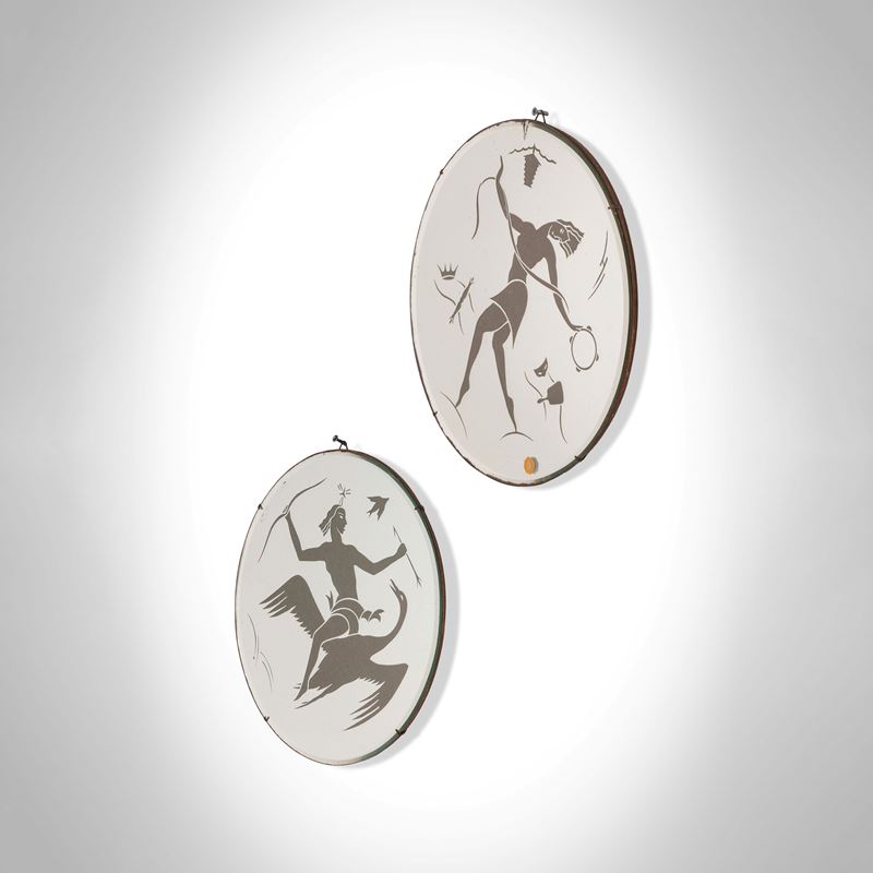 Struttura in legno e cristallo specchiato con decori serigrafati.