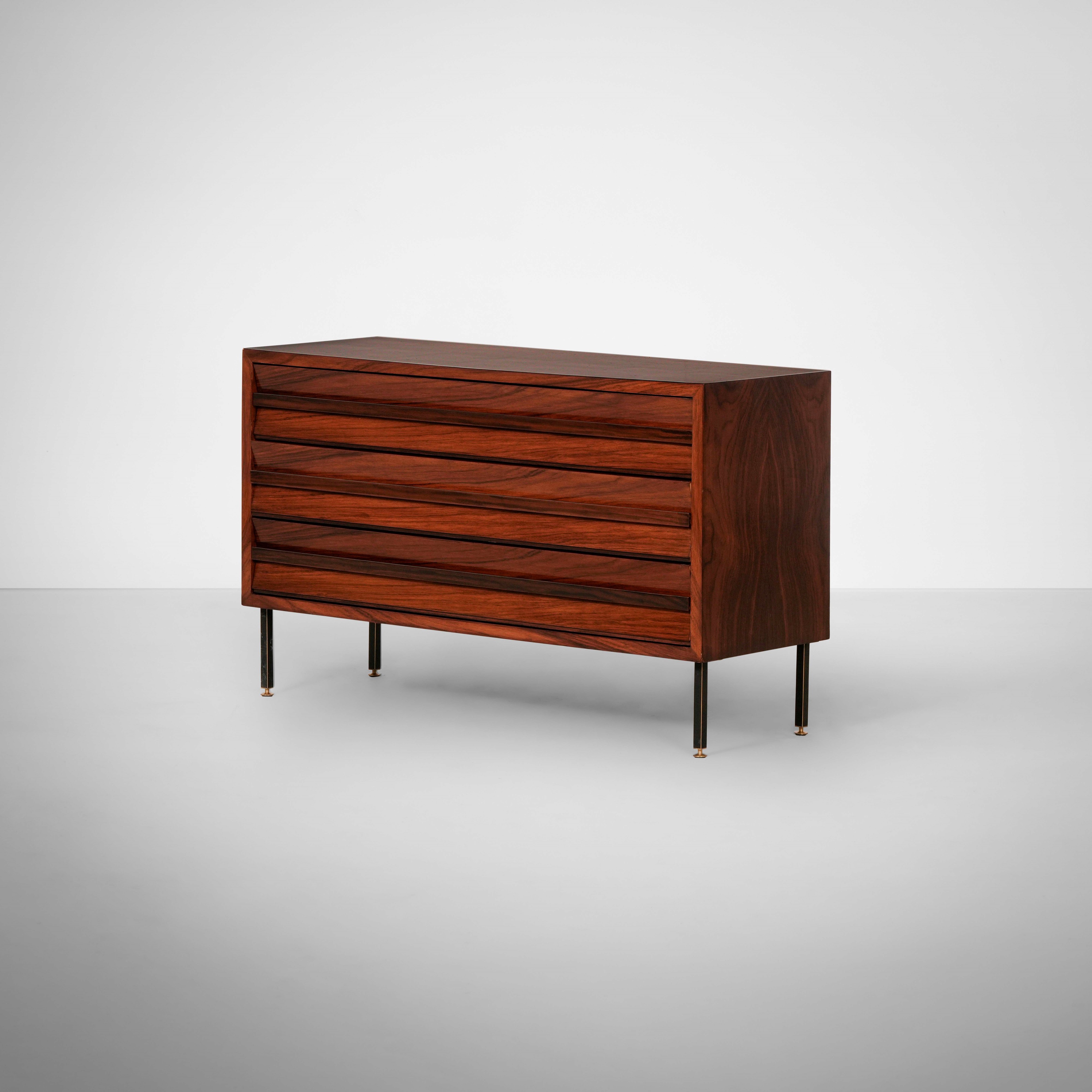 Struttura in legno impiallacciato, sostegni in metallo laccato e puntali in ottone.