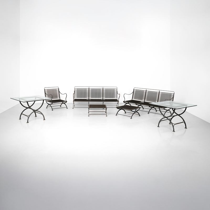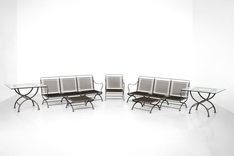 Composto da due panche, due tavoli, una poltrona e due poggiapiedi. Struttura in ferro laccato e rete metallica con piani in cristallo molato.