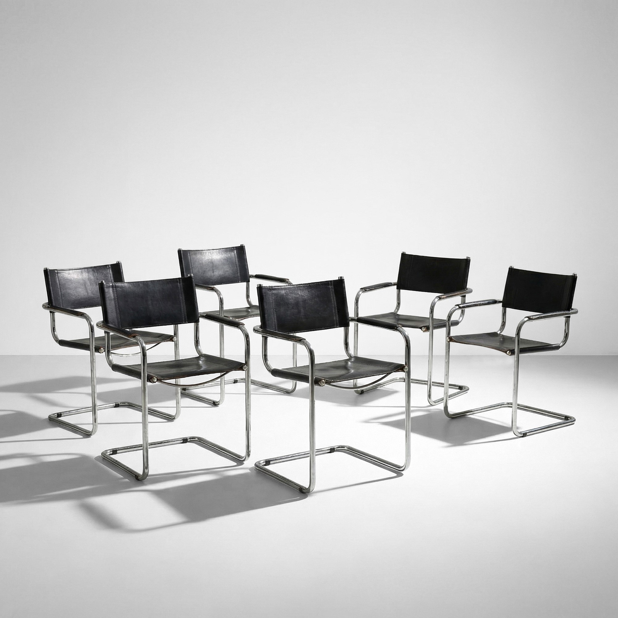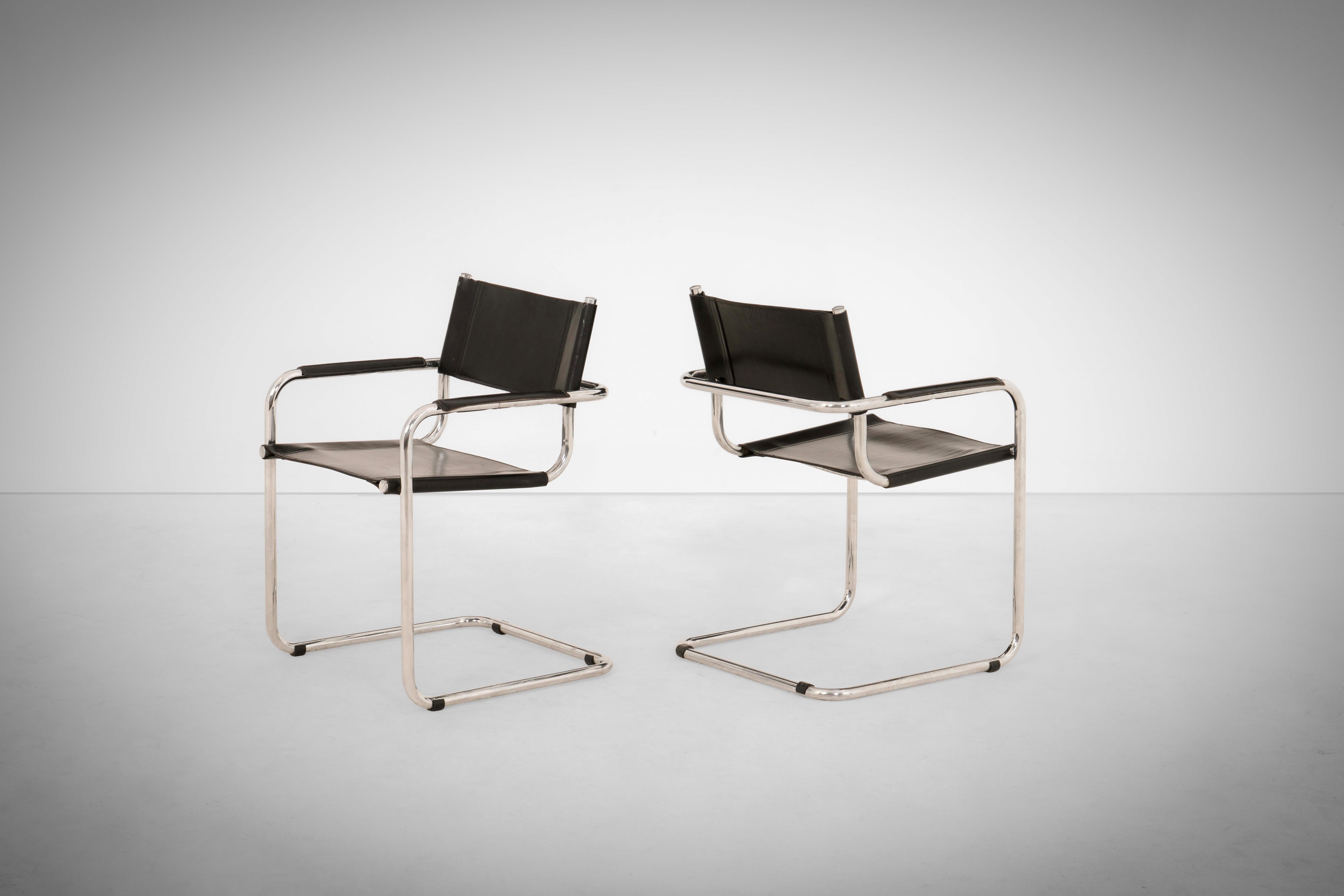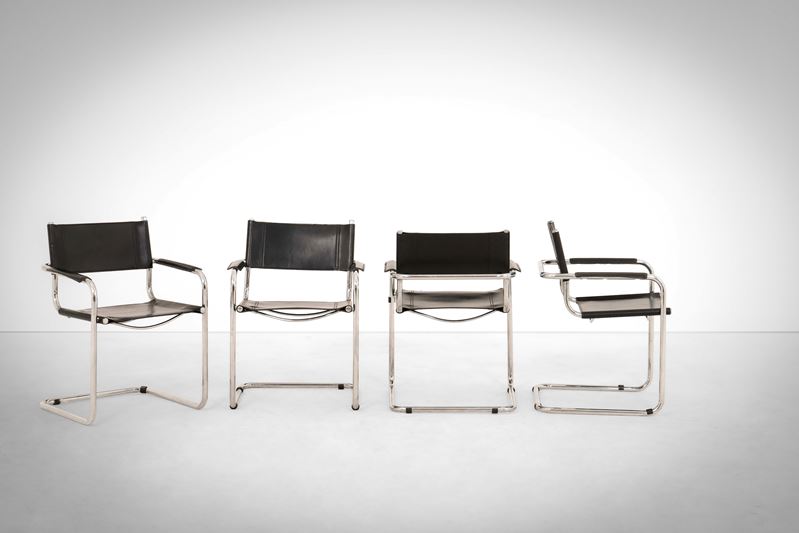 Struttura in metallo tubolare cromato, seduta e schienale in cuoio.