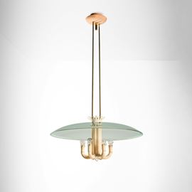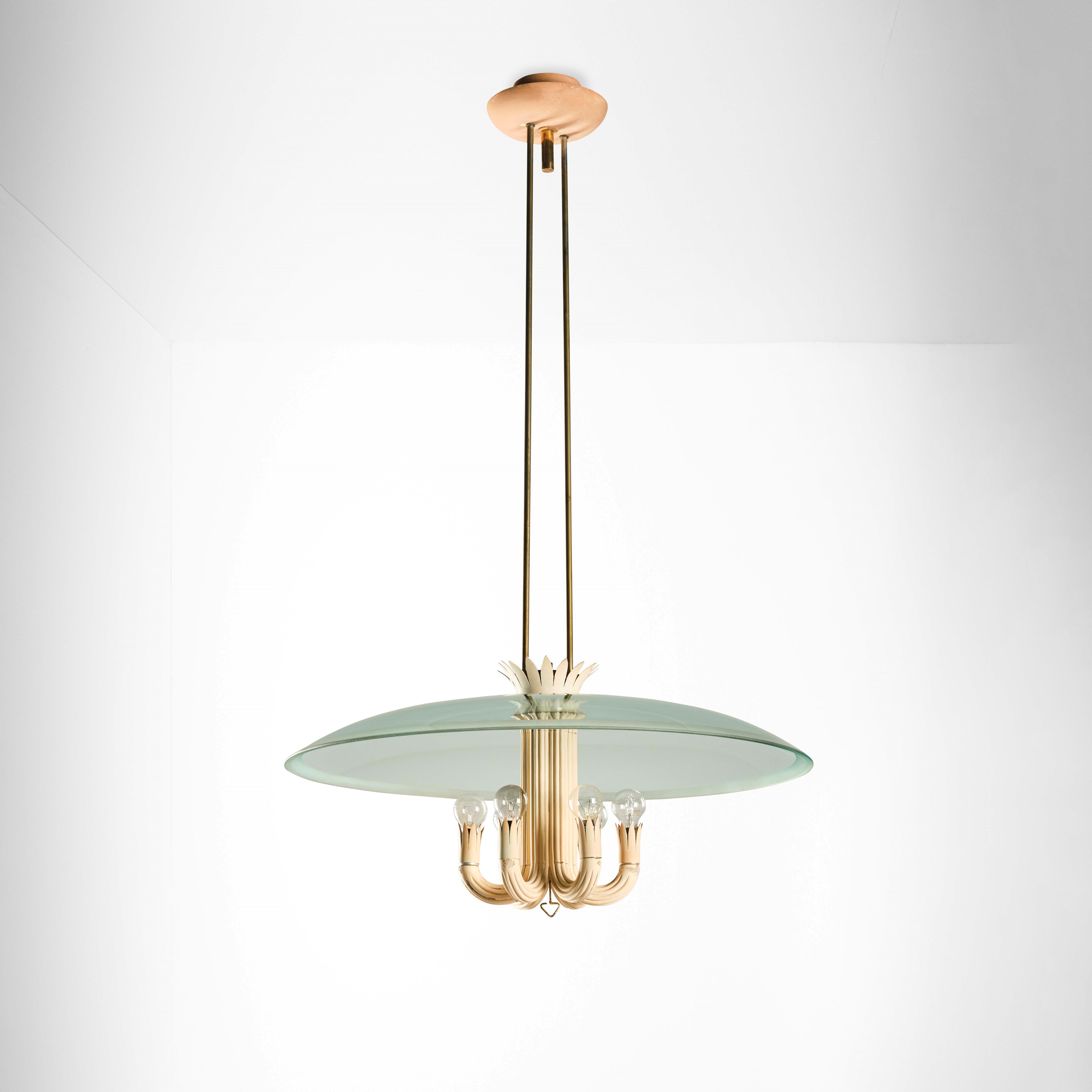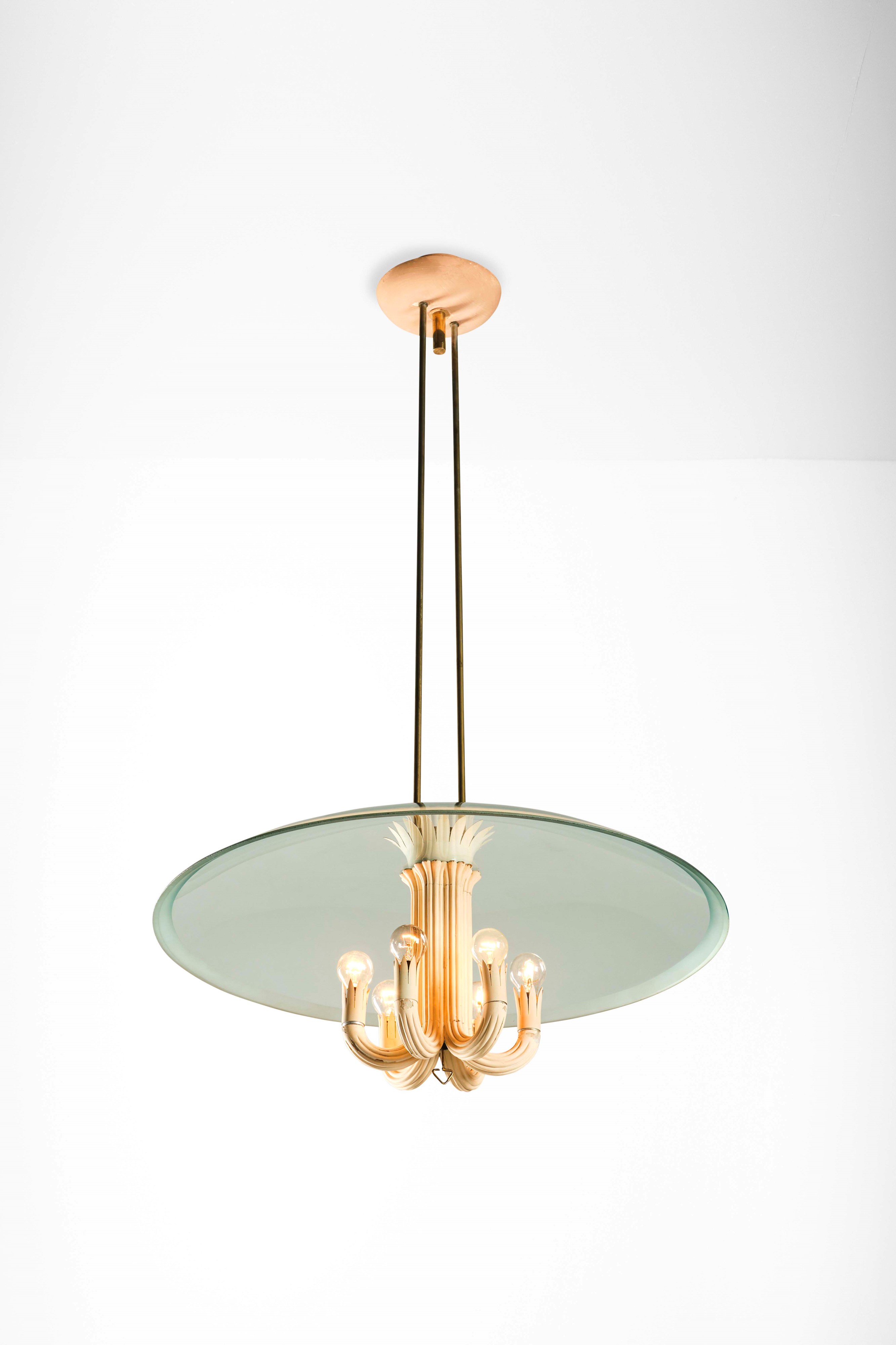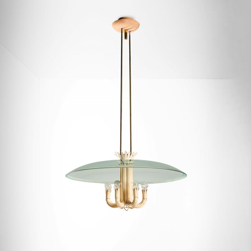 Struttura in ottone e metallo laccato. Corpo in legno laccato. Diffusore in cristallo curvato molato.