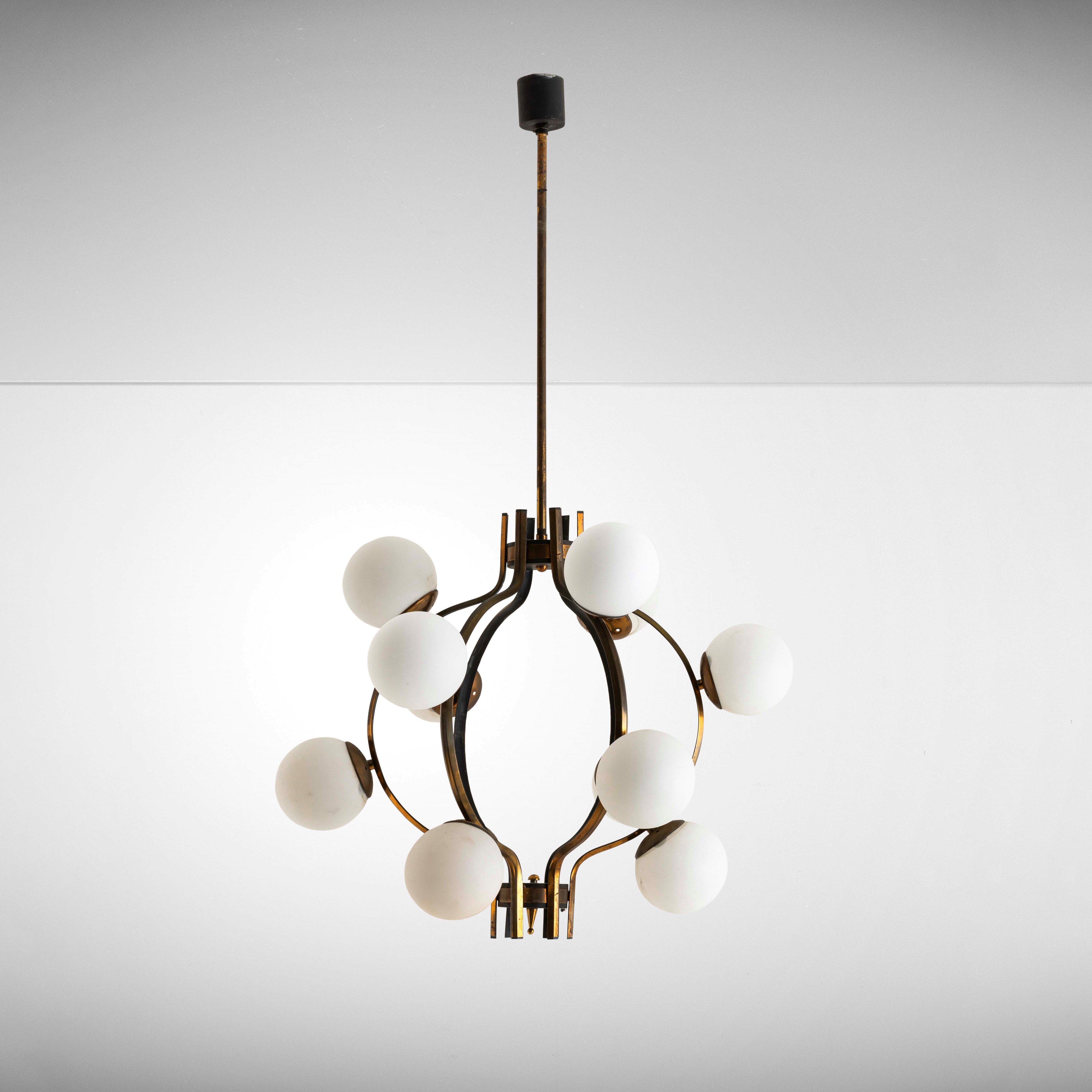 Struttura in ottone e metallo verniciato con diffusore in vetro opalino satinato.