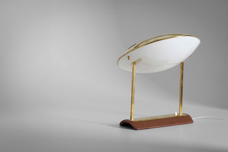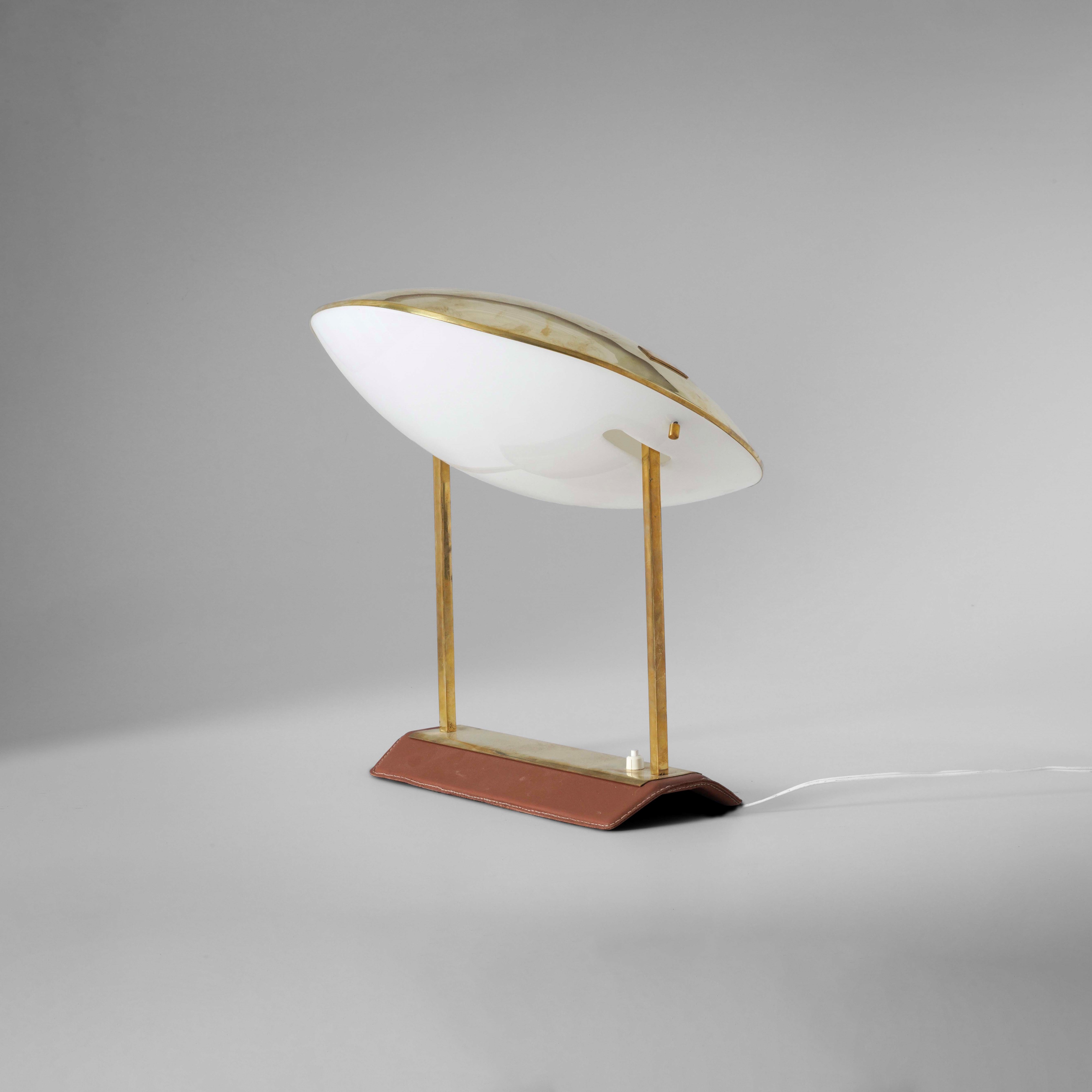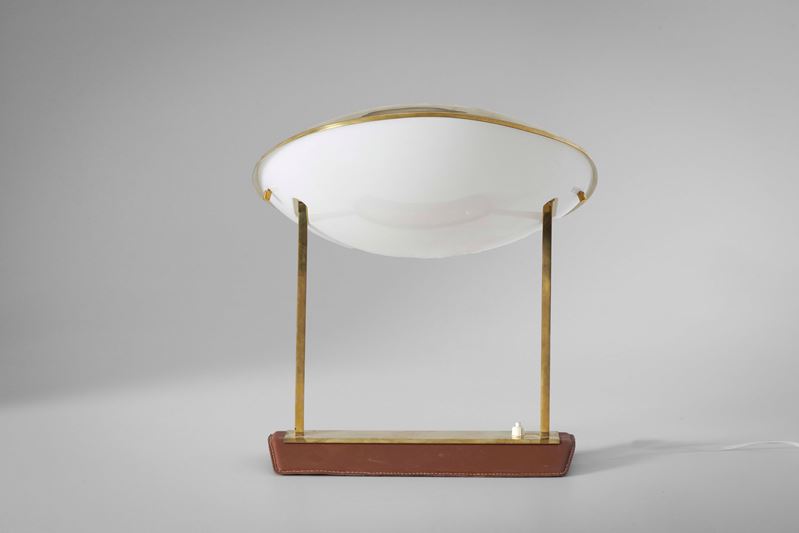 Montatura in ottone, base rivestita di pelle e diffusore in perspex opalino.