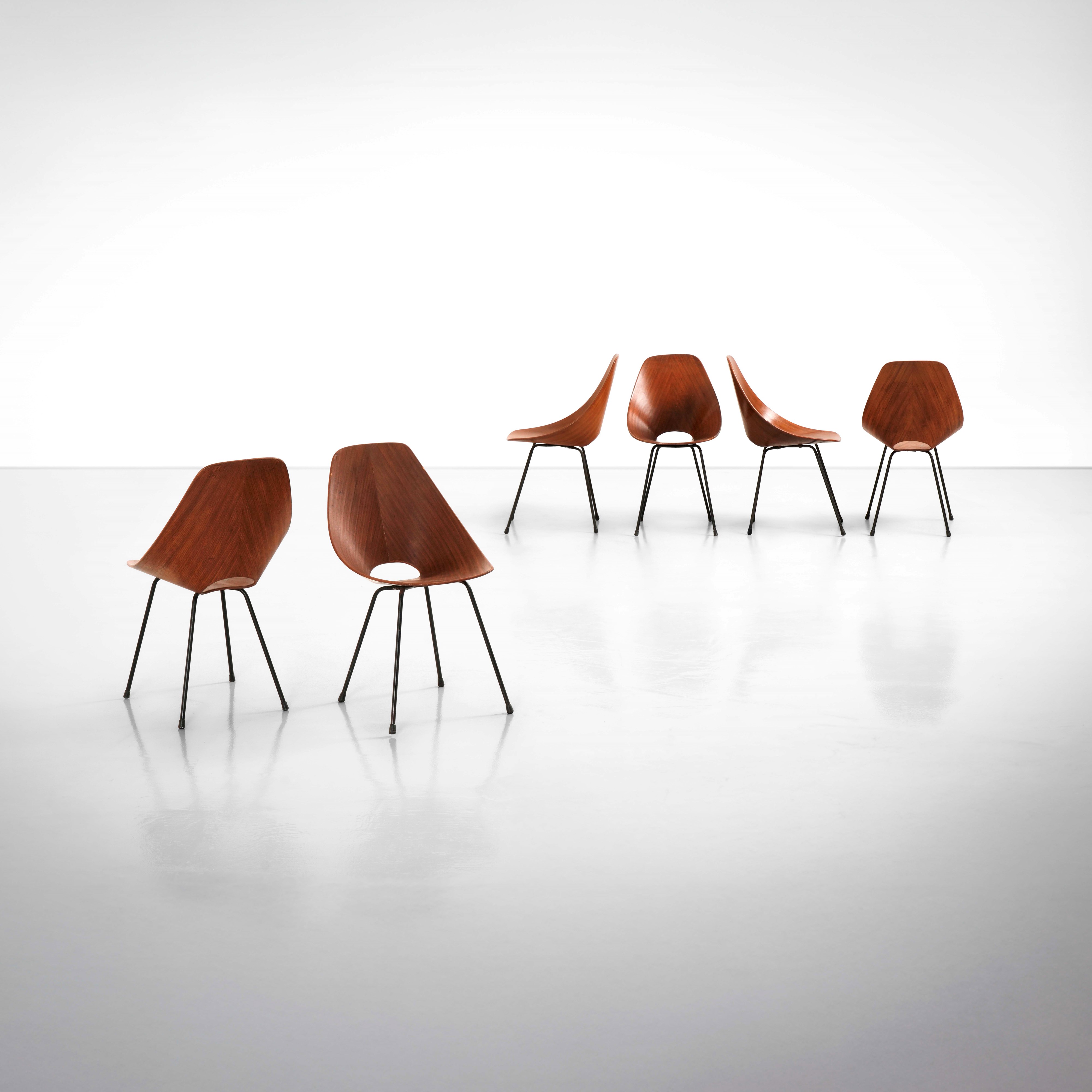 Sostegni in metallo tubolare laccato e seduta in legno compensato curvato.