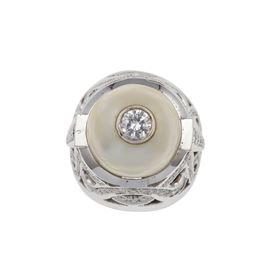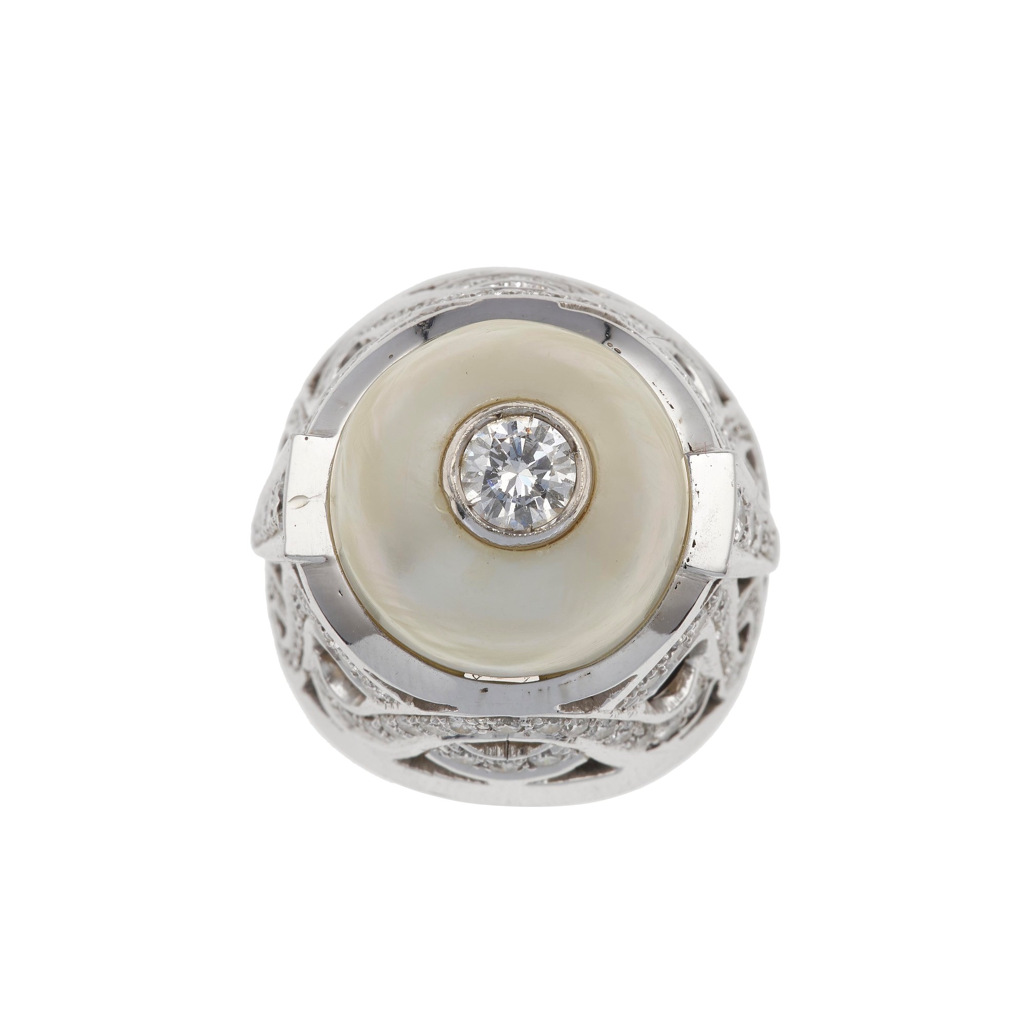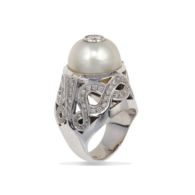 Cultured pearl, diamond and gold ring